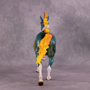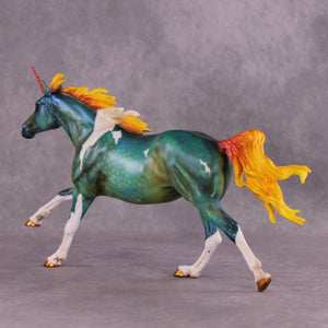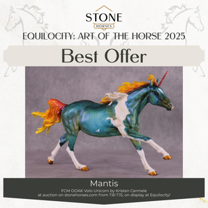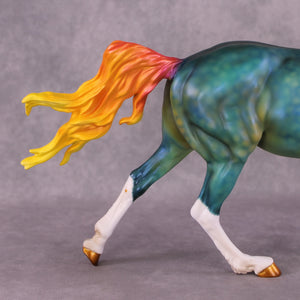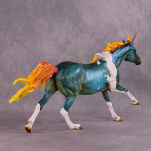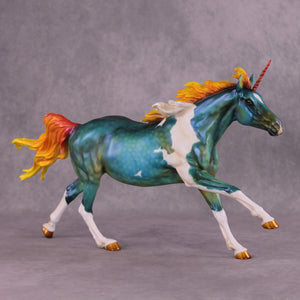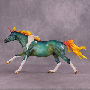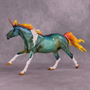 “Mantis” begins on our new Volo Mustang Mare sculpture with her loose flying tail, one listening ear, and a unicorn horn. Kristen painted her to a gorgeous dappled teal pinto with firey sunset tone mane and tail, and a minimal tobiano pinto pattern with etched white markings, shaded detailed hooves, and tons of dimension through this piece.