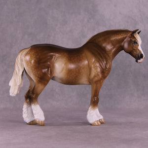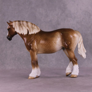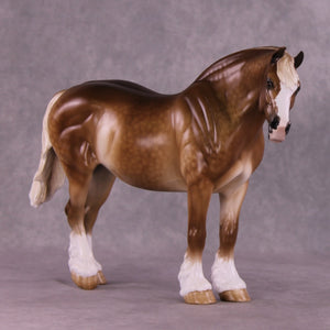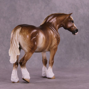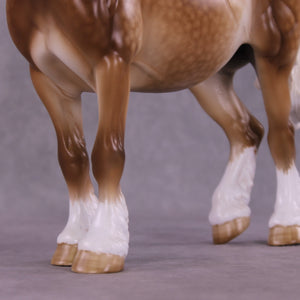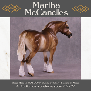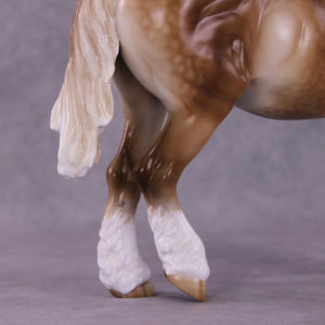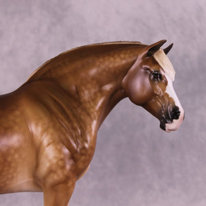 Martha McCandles is our Bunny mold with an adorable light head turn and new expression by Mona, who also gave her her signature long and tendril detailed mane, tail, and forelock. Sheryl packed in the detail on this piece, including her extra detailing in the face she always does! She has gorgeous heavy dappling, four white socks with detailed hooves, a wide blaze, delicately shaded mane and tail, and more.