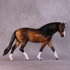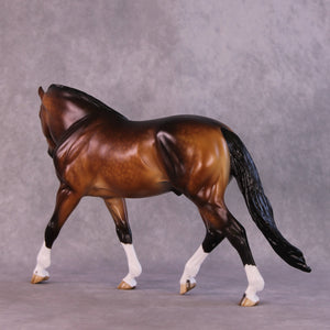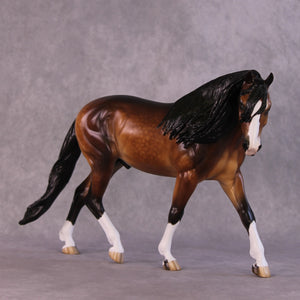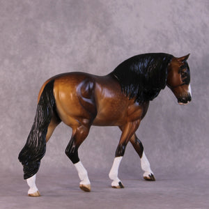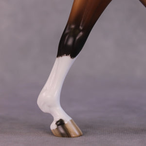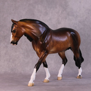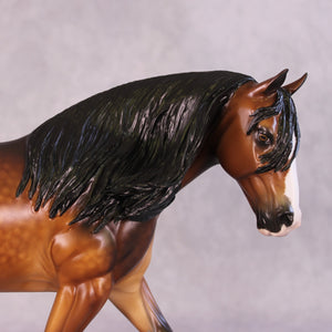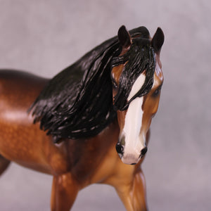 “McClintock” begins with our Irish Draught sculpture, and Mona gave him a dynamic turned head and neck, and then a voluminous mane, tail, and forelock with extra tendril detailing. Sheryl went classical on this one and painted him to a stunning rich dappled bay with four white socks, hoof striping, etched marking edges, and a wide blaze. He is gorgeous!