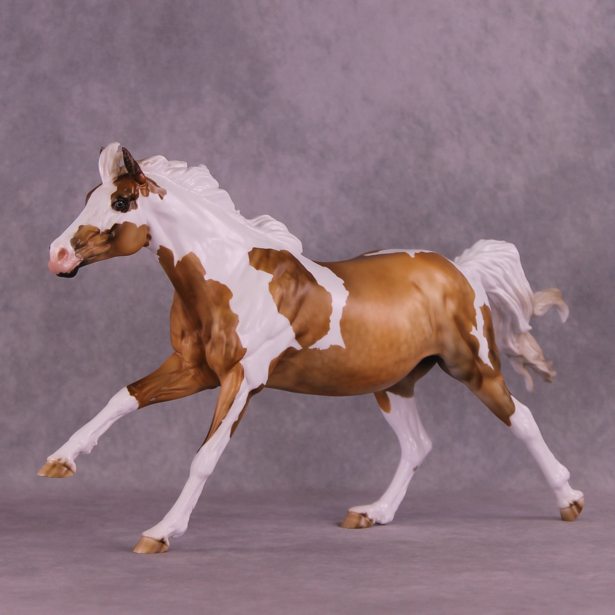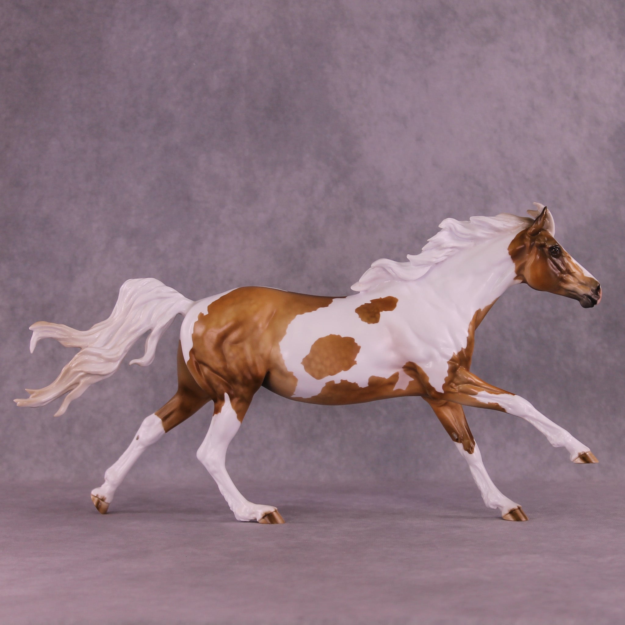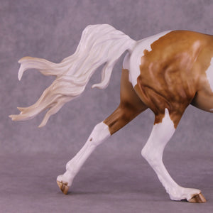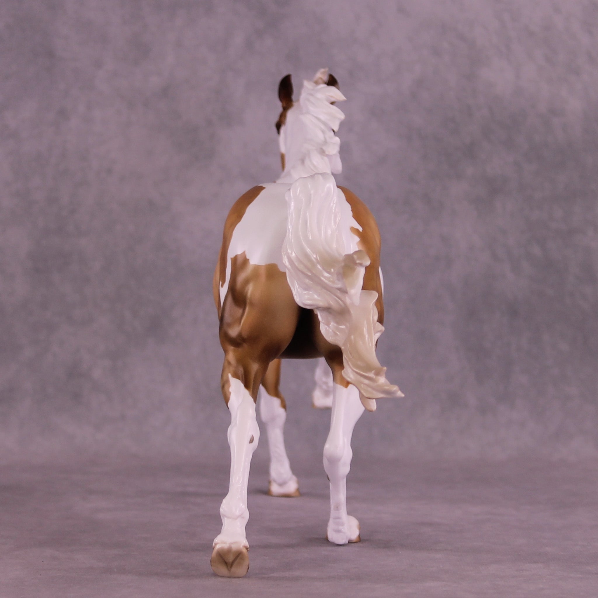 Julie worked with our Volo sculpture here, with her flying mane and tail customized to be slightly to the side, showing extra movement. She has her ears customized fully forward, looking ahead to the future. Julie painted her to a stunningly beautiful shaded palomino tobiano with dapples, hoof striping, shaded whites, and loads of detail packed into this piece.