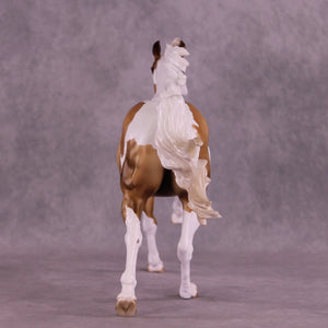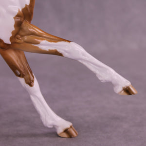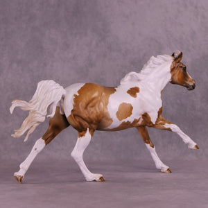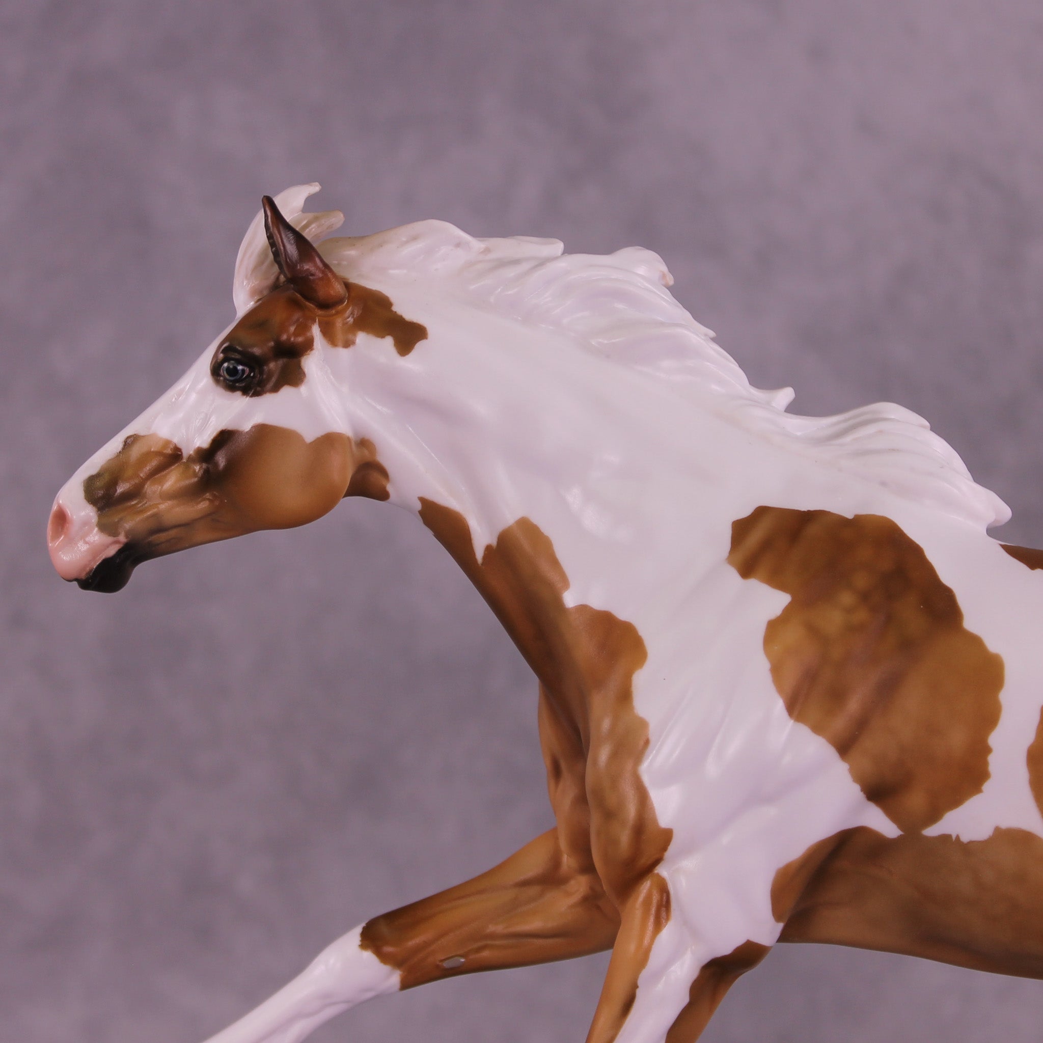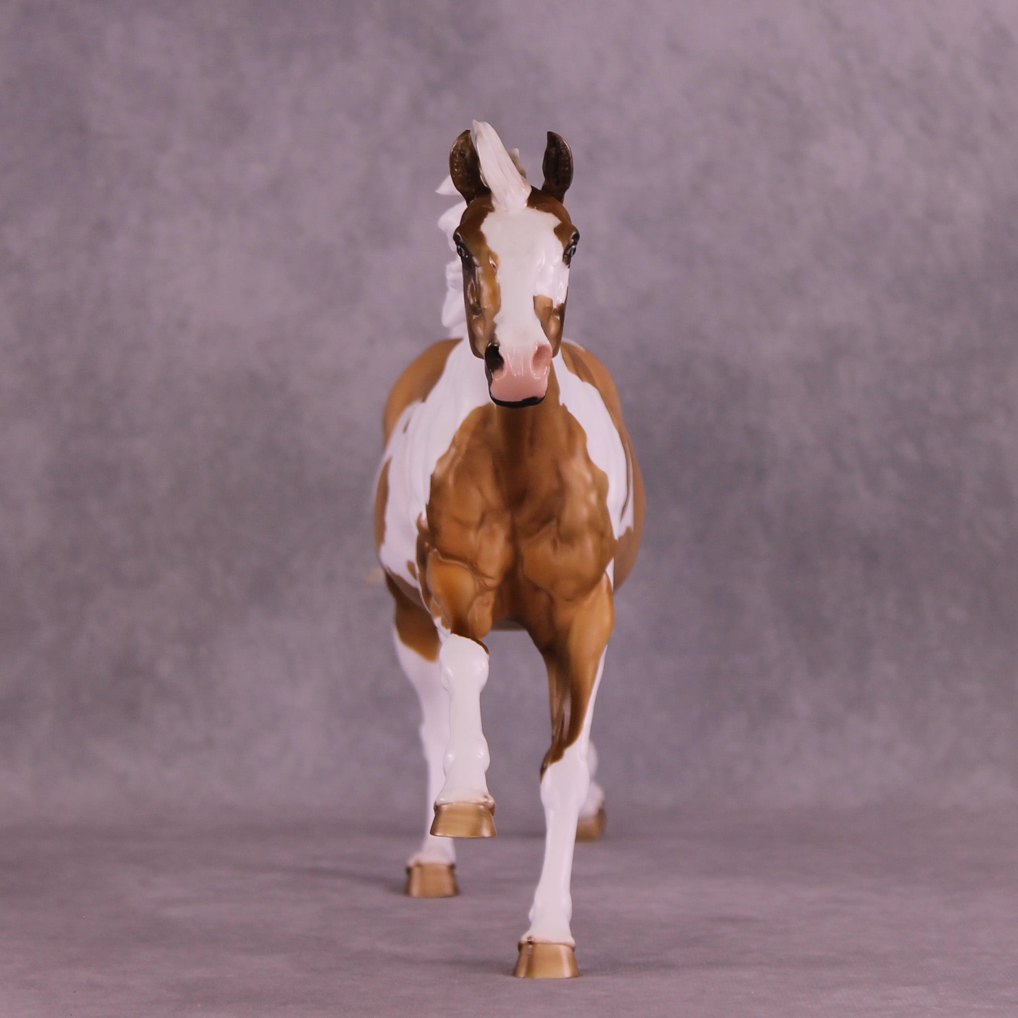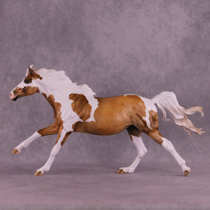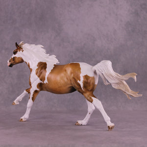 Julie worked with our Volo sculpture here, with her flying mane and tail customized to be slightly to the side, showing extra movement. She has her ears customized fully forward, looking ahead to the future. Julie painted her to a stunningly beautiful shaded palomino tobiano with dapples, hoof striping, shaded whites, and loads of detail packed into this piece.