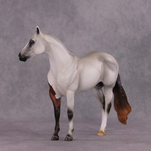 “Mick Mous” features a customized mane and forelock by Amanda, and then a really eye catching grey paintjob with light resist dappling, fleabites, and a unique somatic mutation! He has the perfect balance between soft shading and drama, and will stand out in any show string in the best ways.
