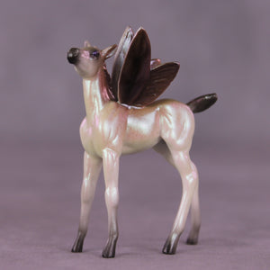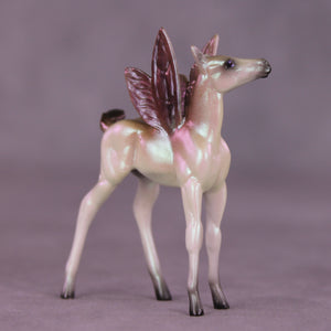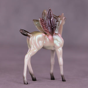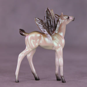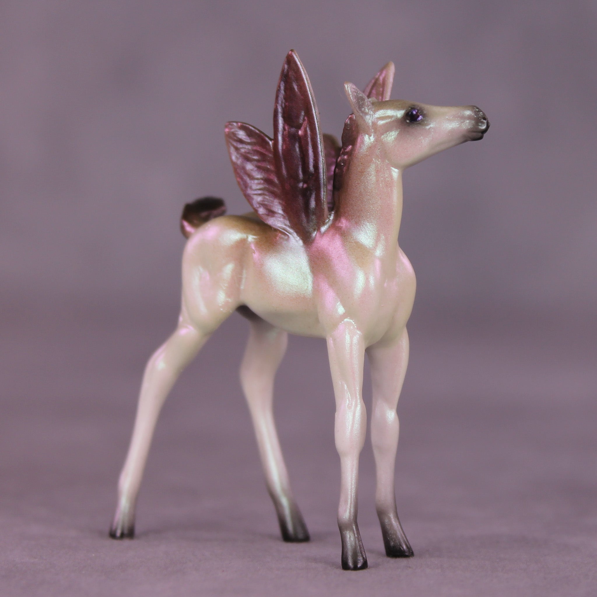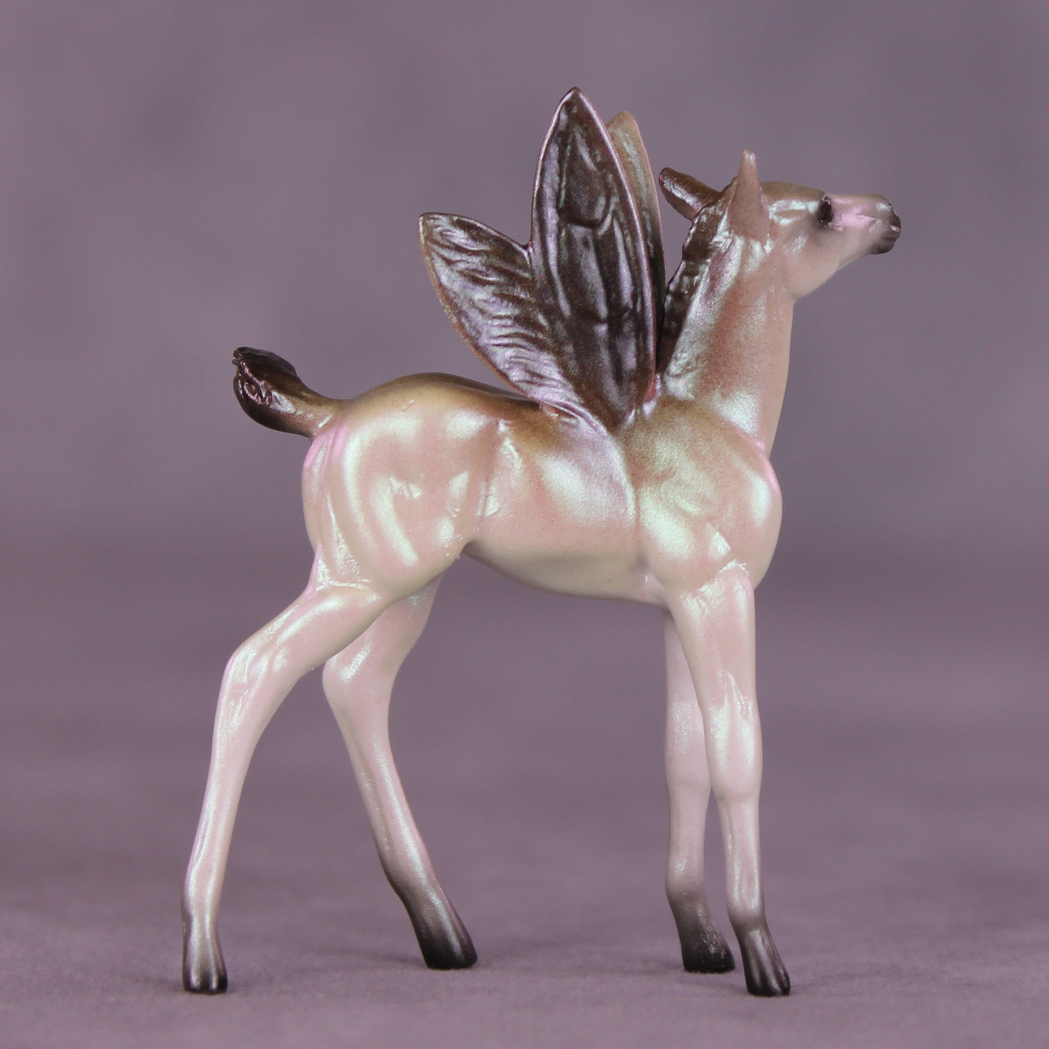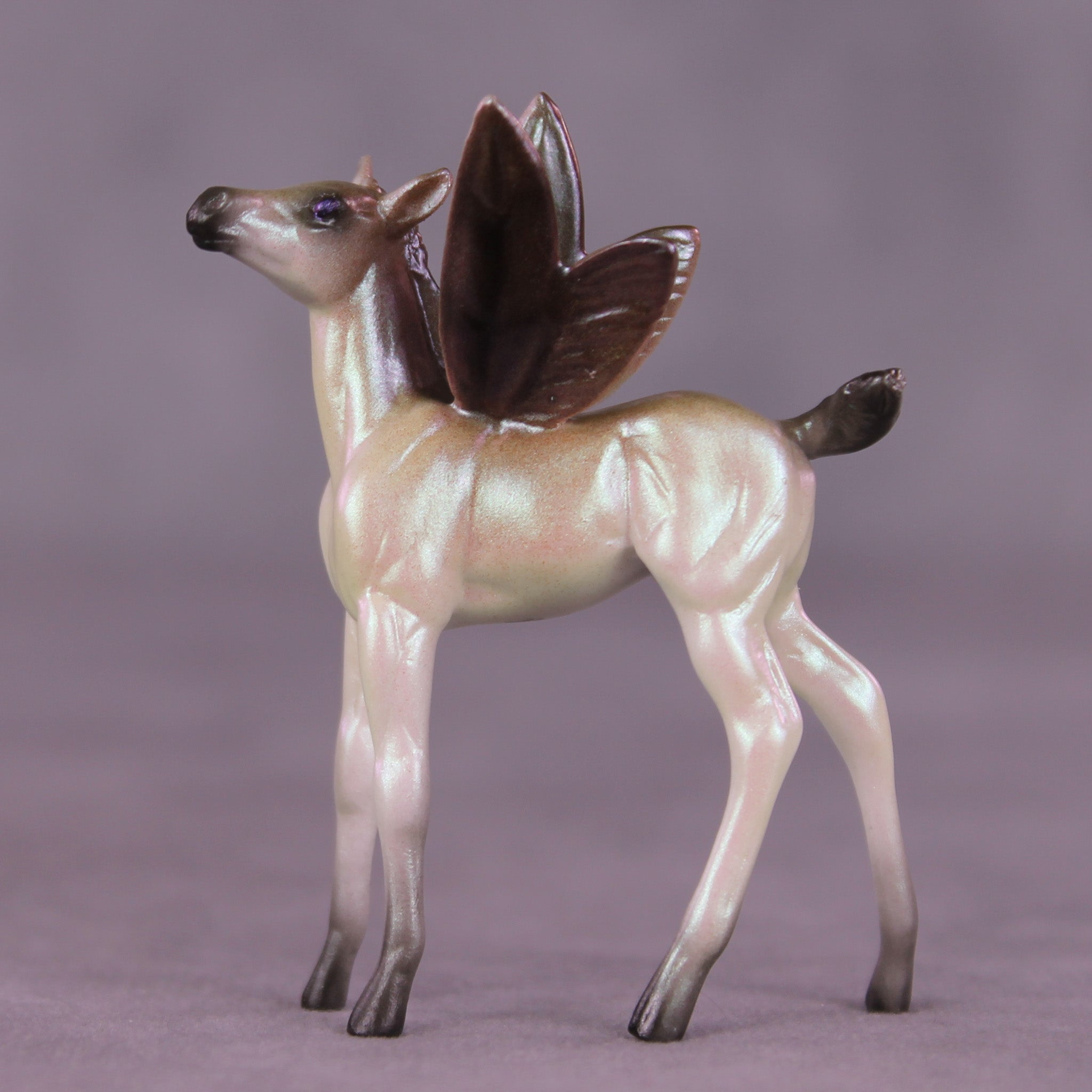 You can’t have a dragonfly mare without her baby! Tiffany customized our Chip Foal to give her hand-carved dragon fly wings, and topped her off with a gorgeous iridescent color shift pearl with green, red, and purple shimmer to match her momma.