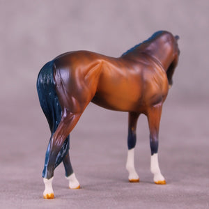 Minelye begins on our Chip Thoroughbred sculpture. Kristen customized her to be a mare, and then turned her head and neck, and gave her a whole new extra long and detailed mane, forelock, tail, and unicorn horn. She is then painted to a lovely blue dappled bay with four socks and blue shading in her legs, mane, tail, and forelock. Kristen is masterful at colors that are a mashup of realistic and decorator elements, and this is an excellent example!