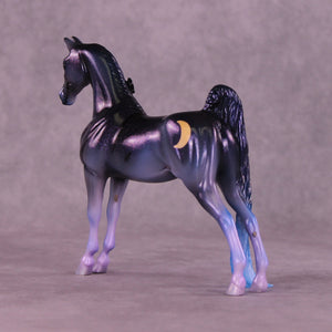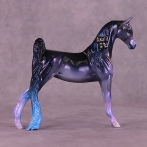 Miss Moonlight is a Pebble Saddlebred mare customized by Melanie Miller to add a lovely three-dimensional bow in her mane. She is painted by Pernille in pink, purple and blues and some really neat iridescent color shift pigment in shades of purple, violet, and blue, finished in gloss.