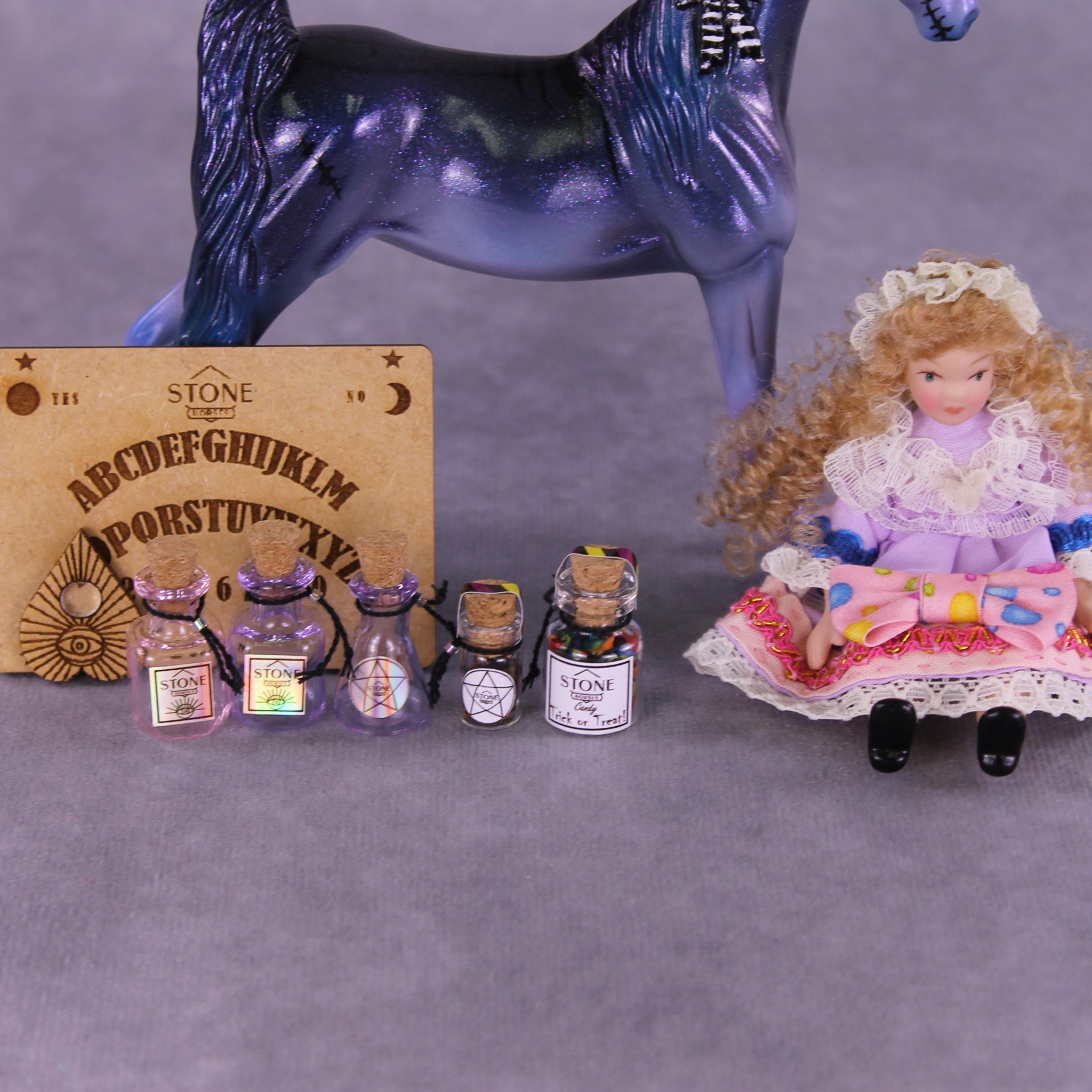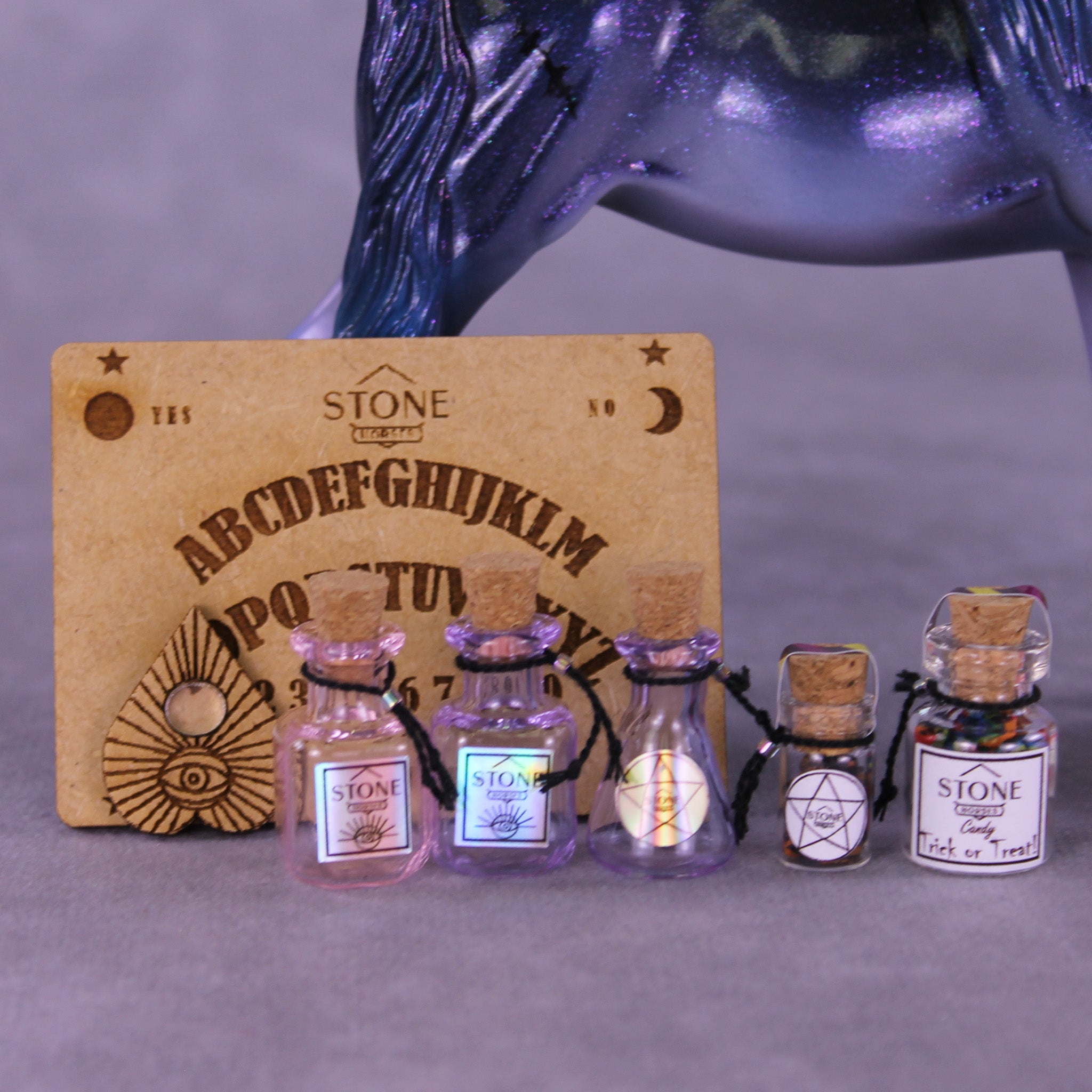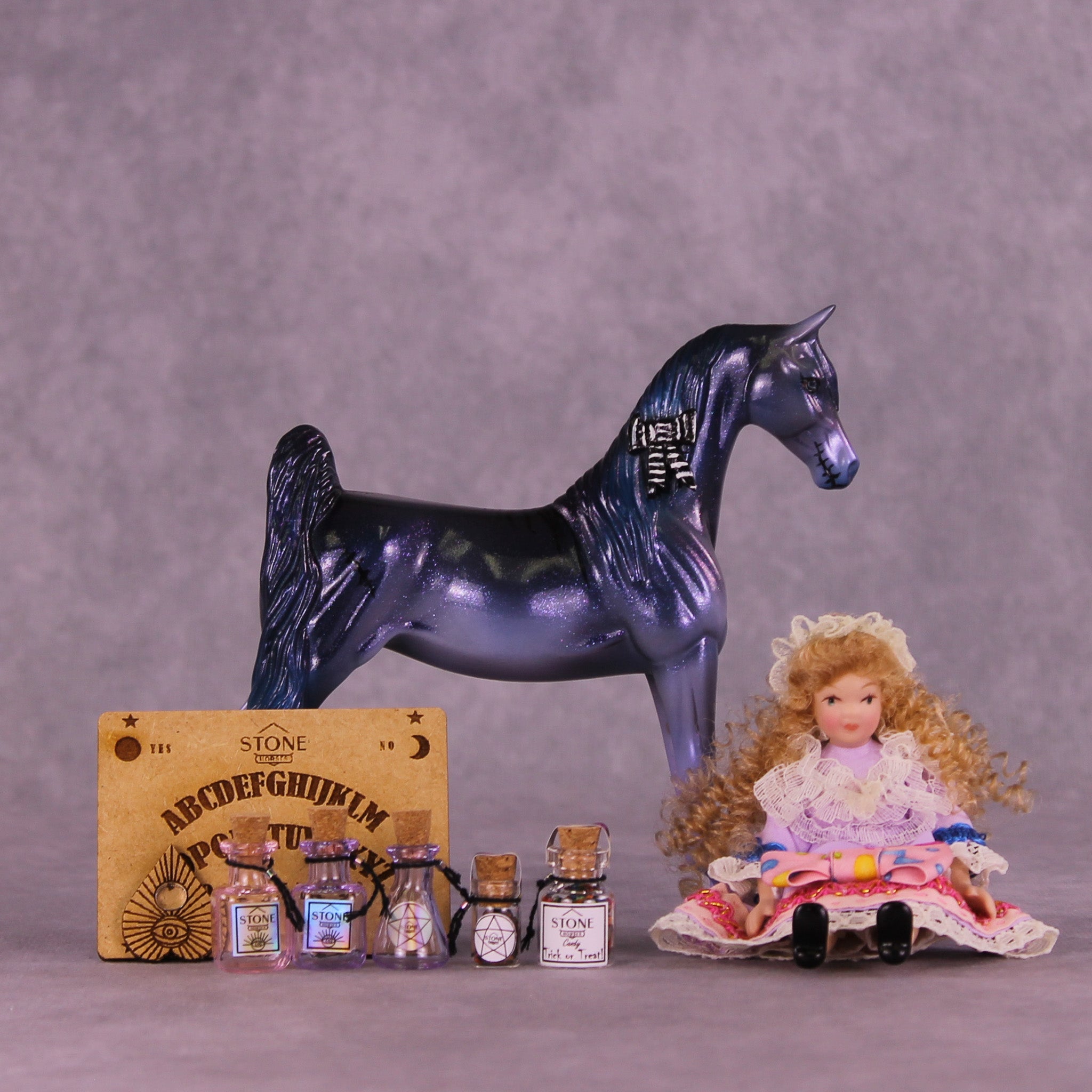 She had stitches hand painted on her, to look like a raggedy doll. Her eyes got a bit of eyeliner and she can't wait to play with you. The moon on her is a salute to Moonlight Madness and the many moons I saw in Shipshewana. The bow on her mane is black and white and a reference to the wonderful world of Tim Burton. Miss Moonlight comes with her own doll, five tiny vials of treats, and a custom laser-etched Ouija board. Remember to let her know she is welcome in your collection once you unpack her, or she may be a bit haunting. (If you would like to decline any part of her extras we respect that 100%, just shoot us an email after your purchase and we will adjust as requested!)