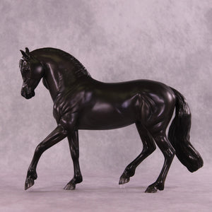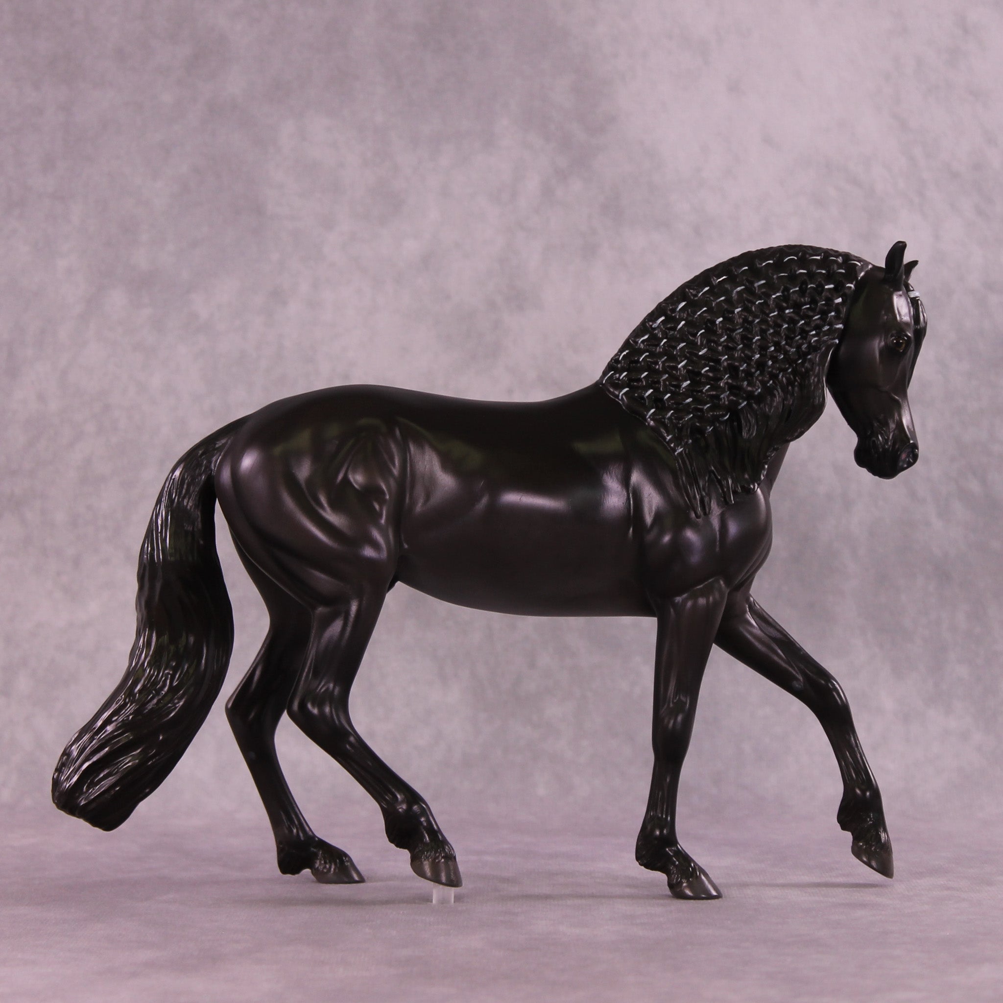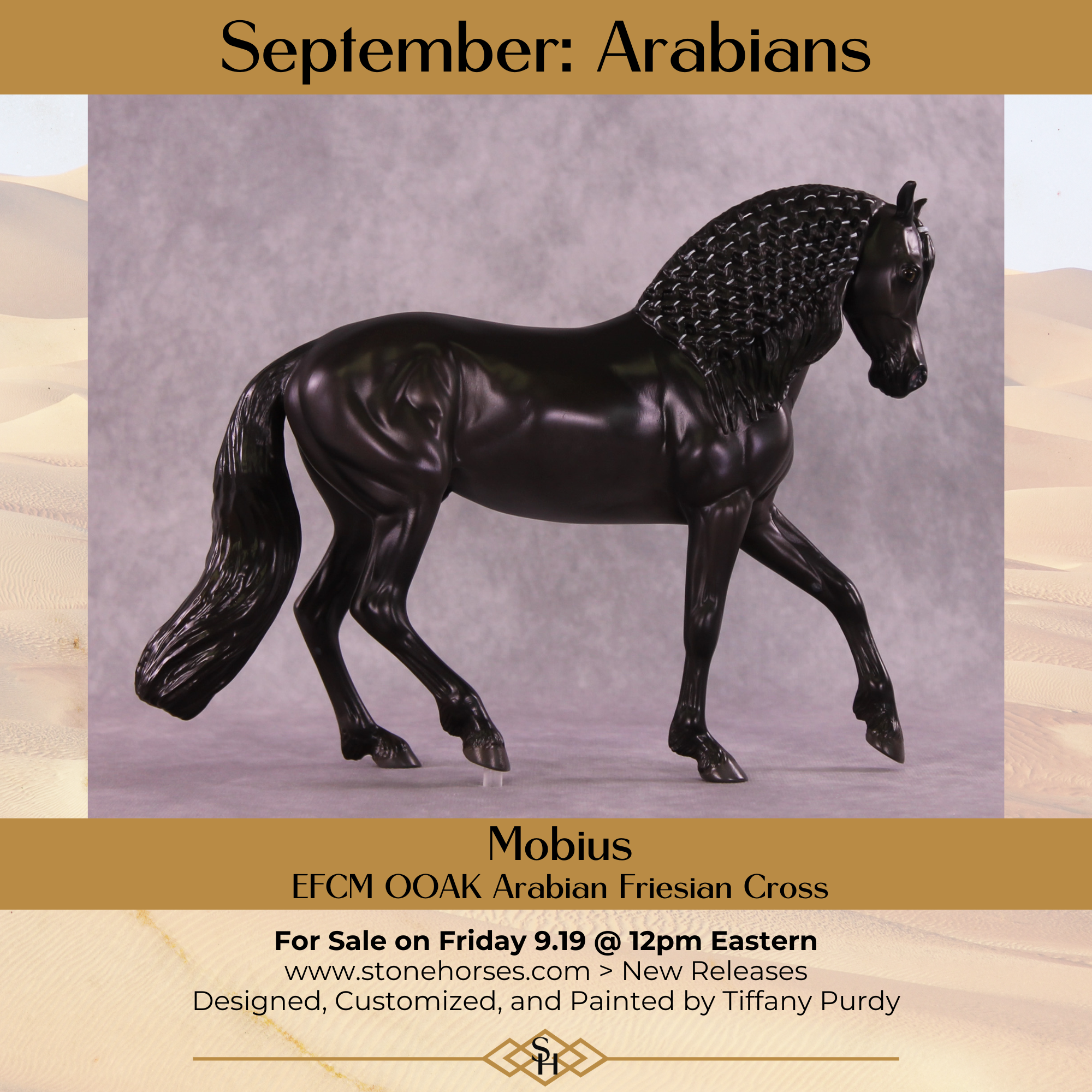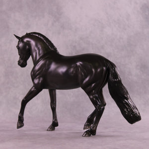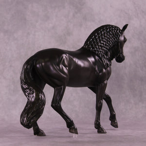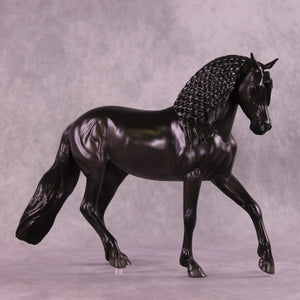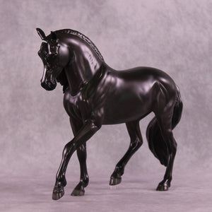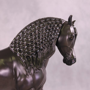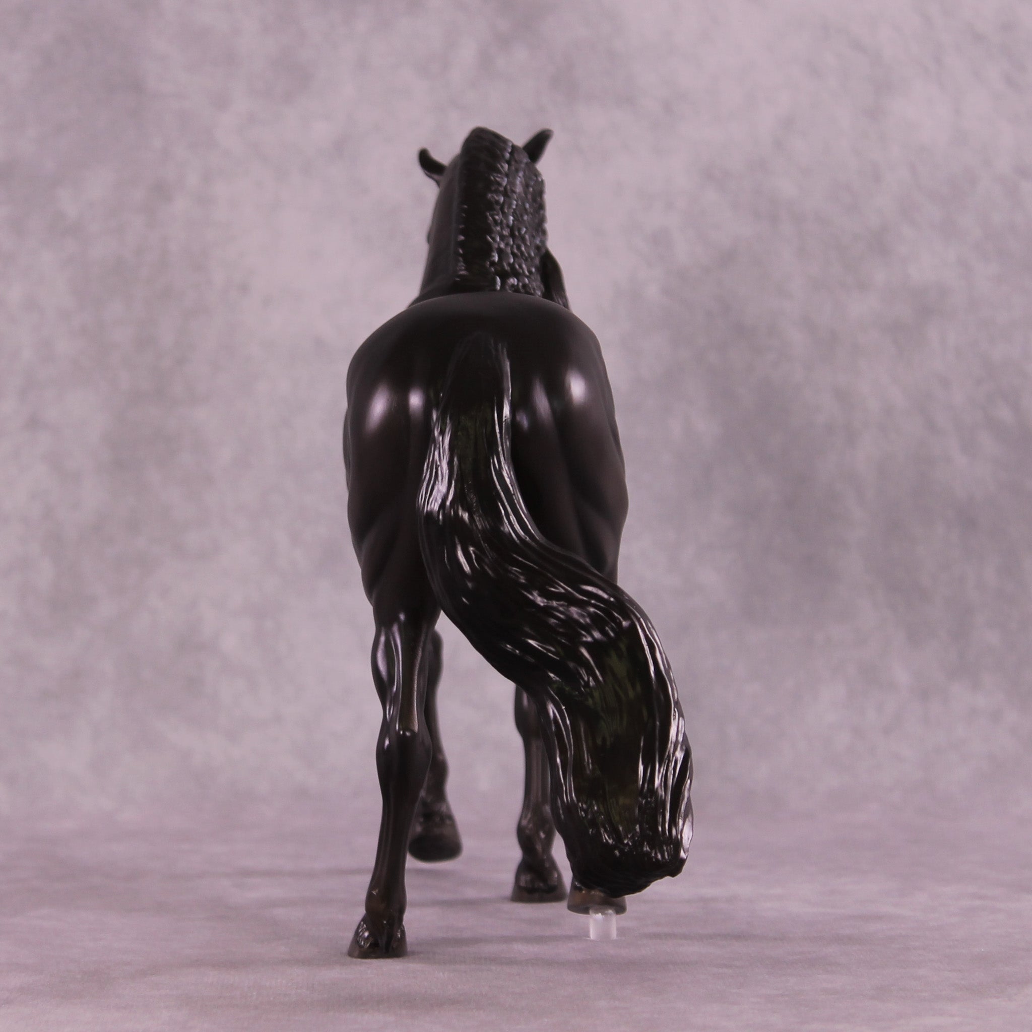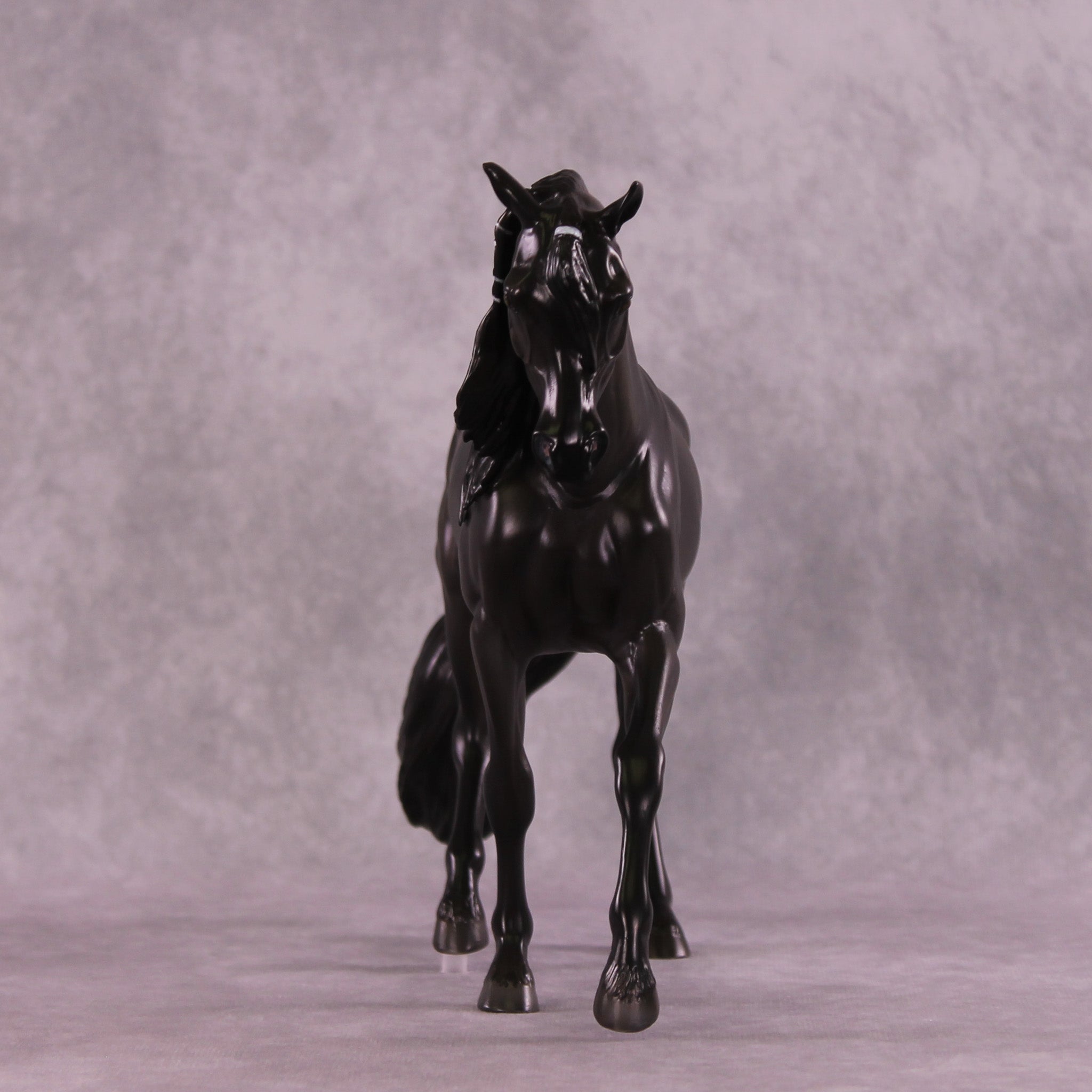 Mobius is an amazing blend of the Arabian Mare, Arabian Stallion, and Andalusian molds to make a gorgeous Arabian Friesian cross stallion. He has newly sculpted ears, added feathering, and a lattice braided mane. He also has a new head and neck along with a swished tail and is finished in a gorgeous shaded black.