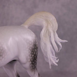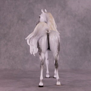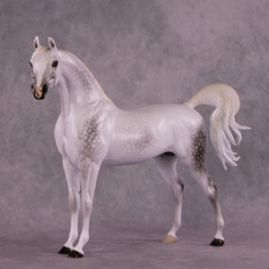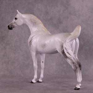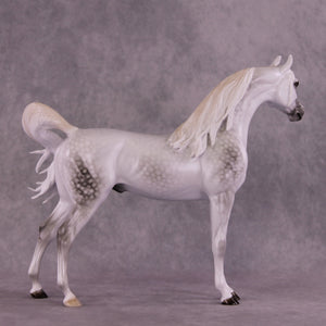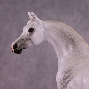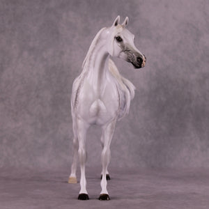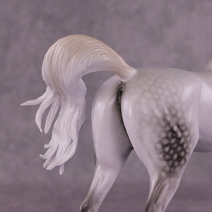 Moonglow is one of only a tiny group of ‘Mona Custom’ Arabian Stallions we have left, and Ellen really did this one justice. Mona gave him a big turned and dropped head, plus a gorgeous aloft tail with tons of motion and tendril detailing, along with his customized mane and forelock that also flow with his movement. Ellen painted him to a stunningly gorgeous dappled light grey with just the right amount of pearl sheen and shading through his face and legs especially.