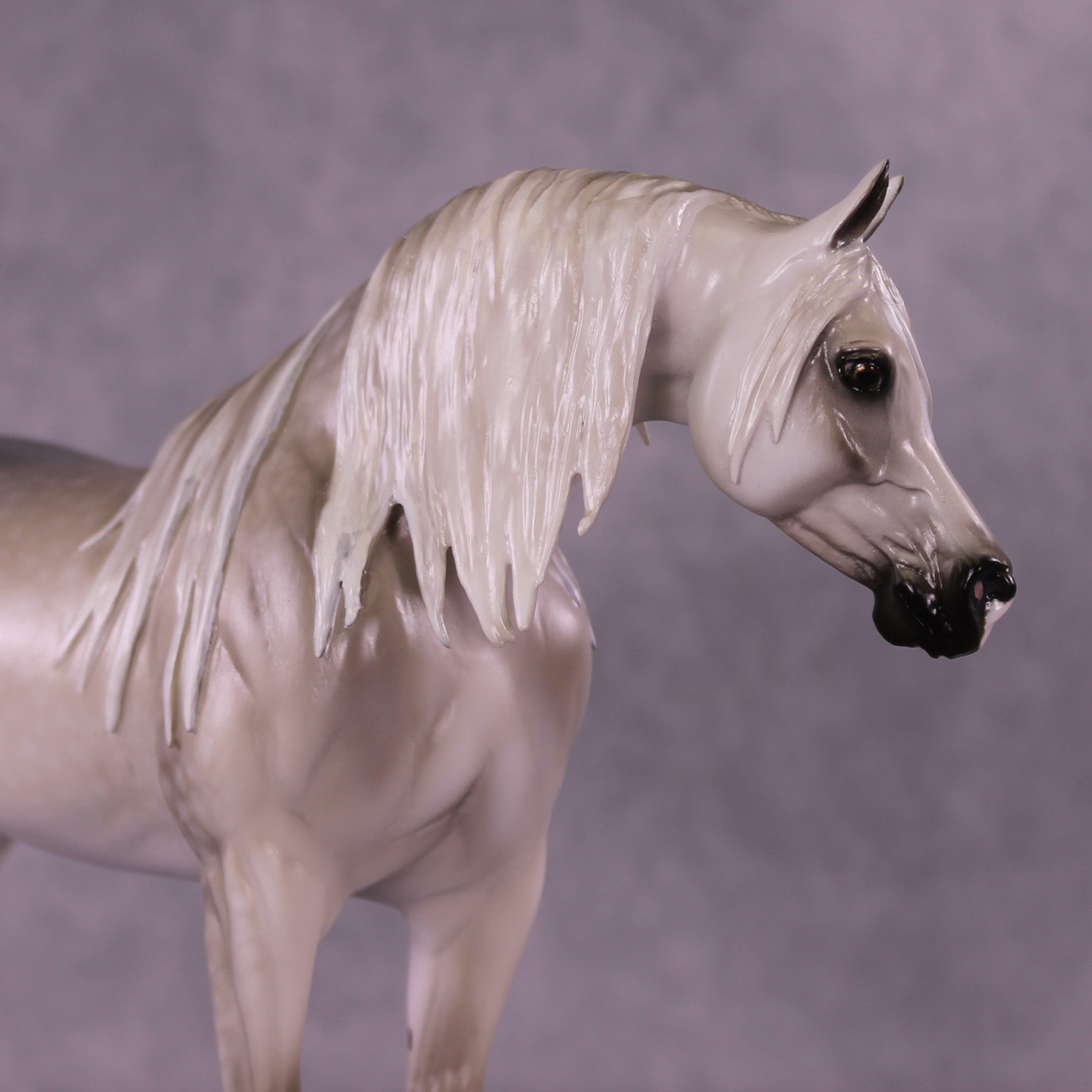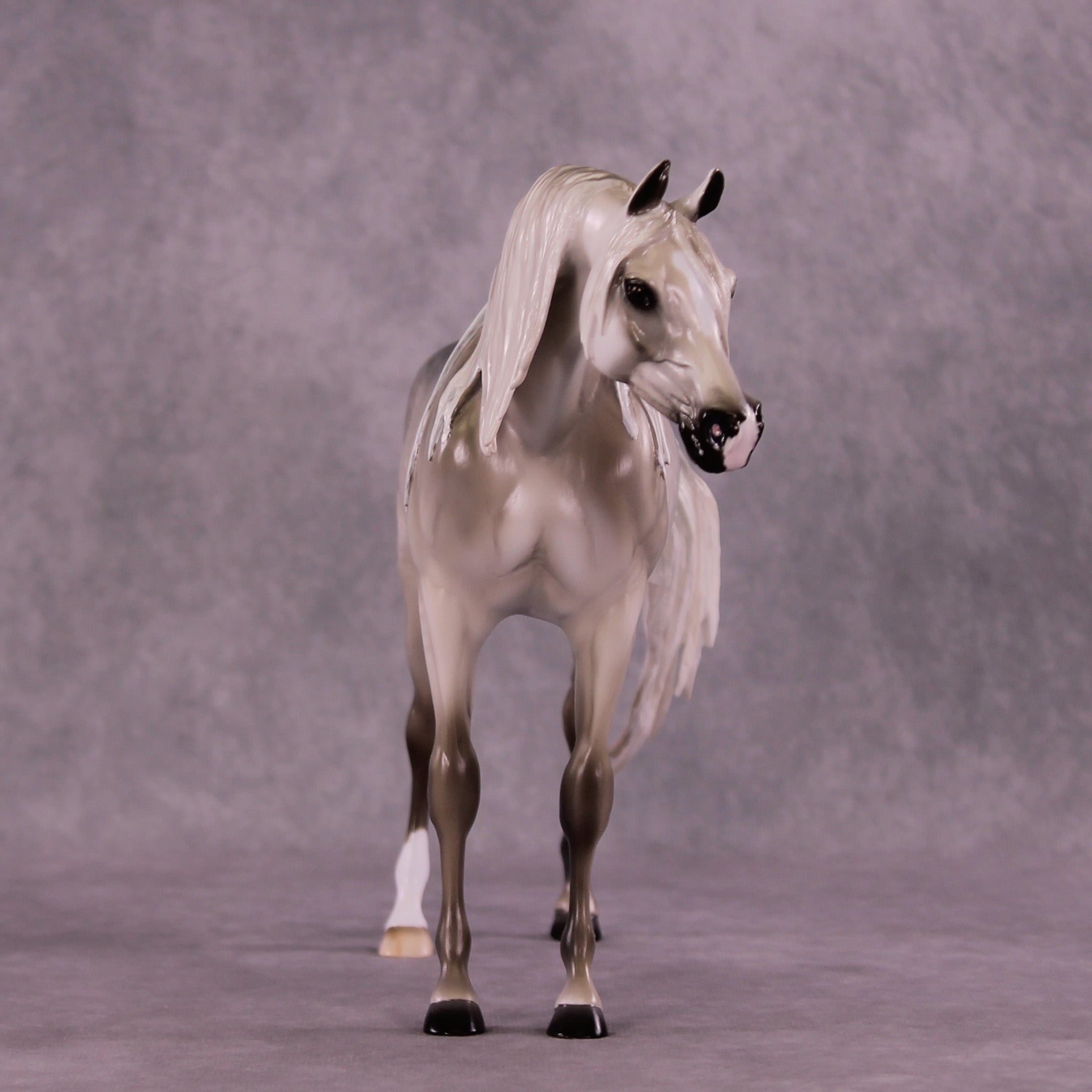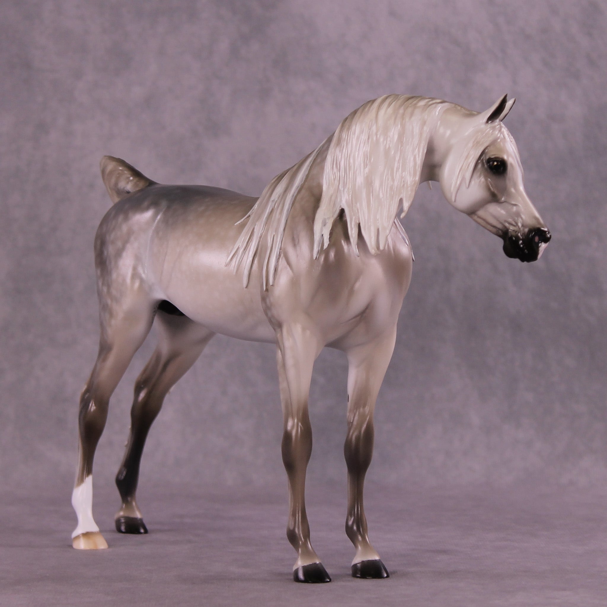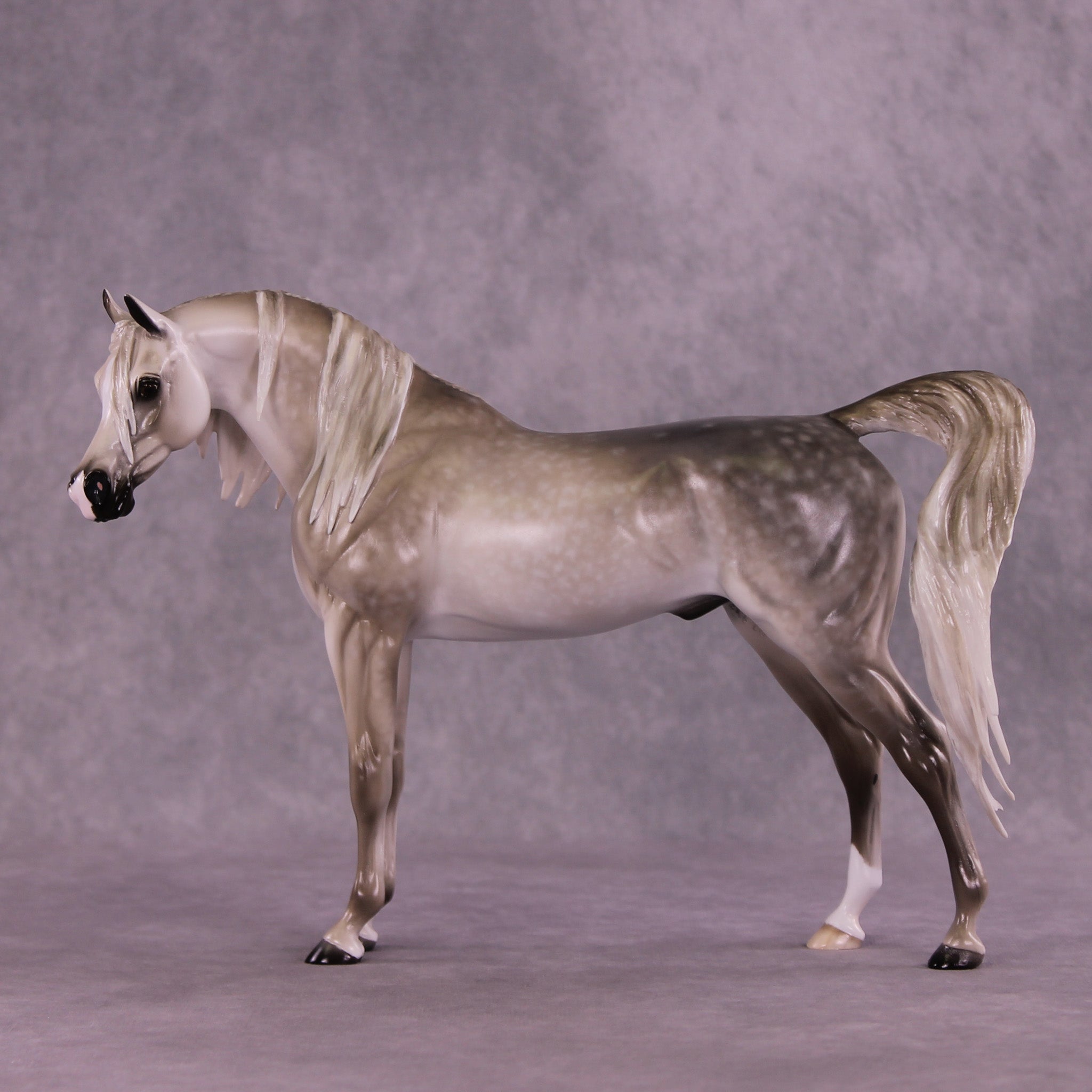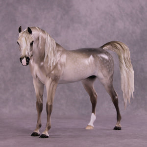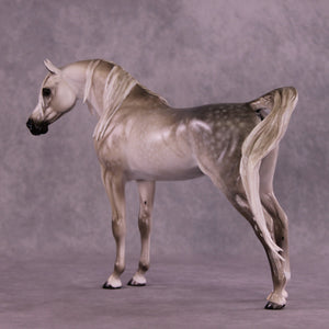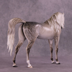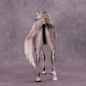 Tiffany gave our iconic Arabian Stallion mold a makeover! She gave him a dramatically lowered and extended head and neck with a gentle turn to the side, resculpted and carved facial detailing, a whole new customized mane with tendrils on both sides of his neck, a sweeping long forelock, and a gorgeously carried customized tail that is softly blowing to the side. She then painted him to a stunning medium dapple grey with dramatic shading through his whole coat, one low sock, and a star with a snip. He is an ethereal beauty!