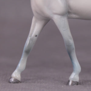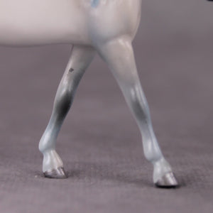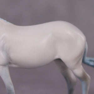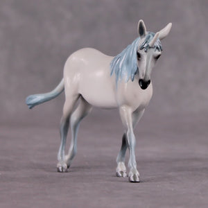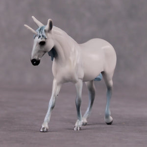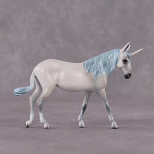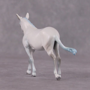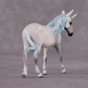 A mini version of The Last Mulicorn, this wee baby version features a smooth lion style unicorn tail, hand-carved unicorn horn, turned head, twitched ears, and new customized mane. She is finished in the same pearl white and blue coat as her large sister.