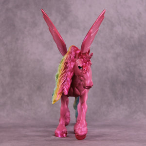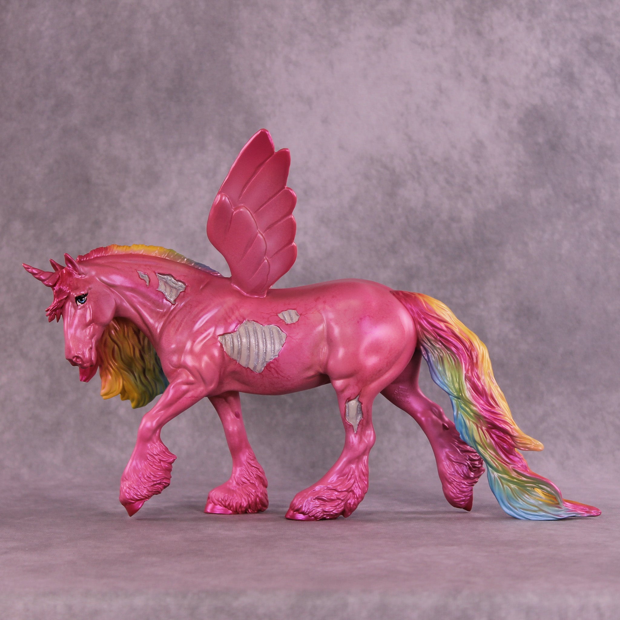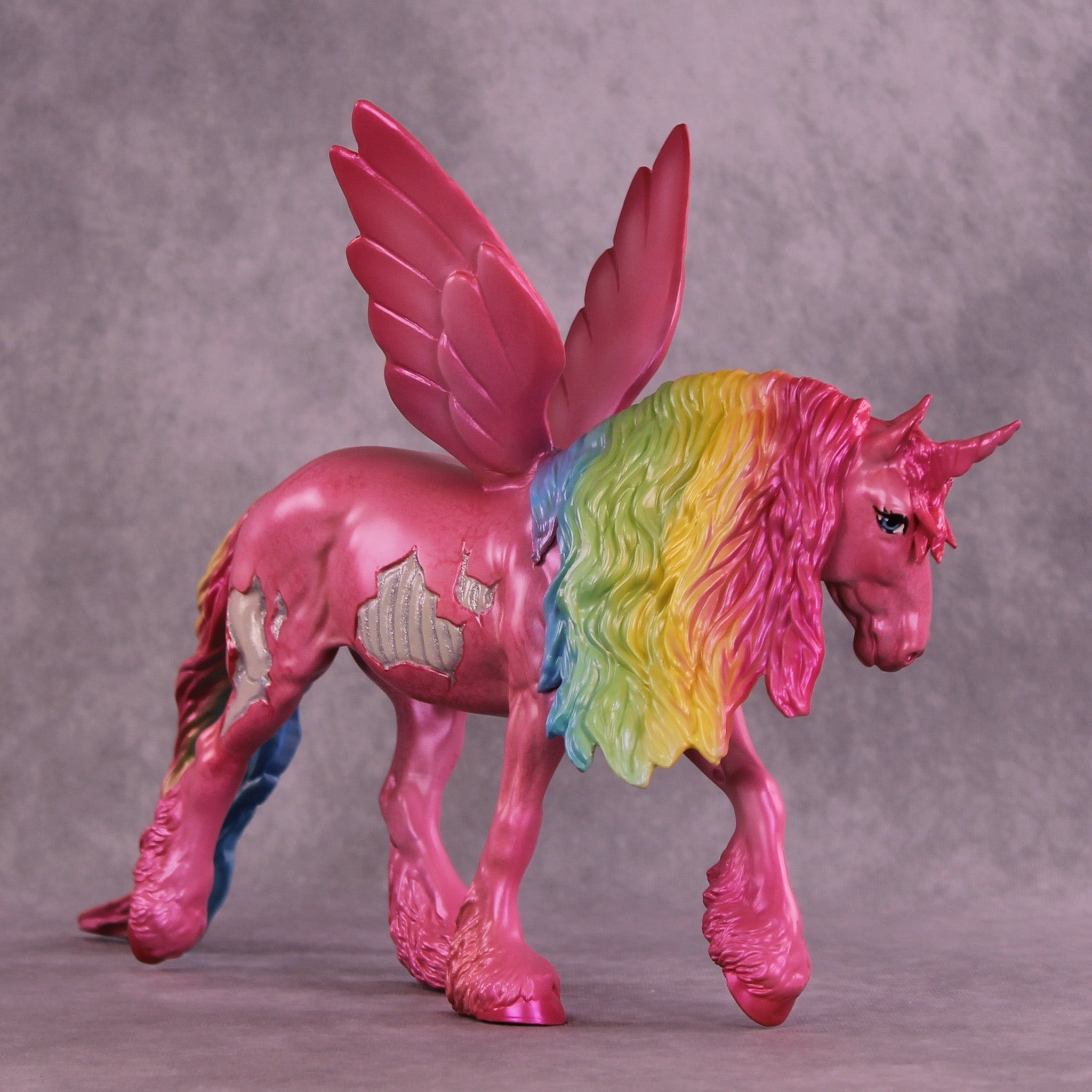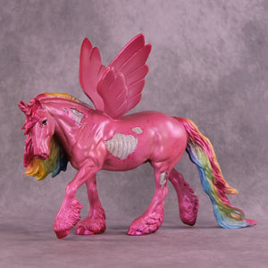 We wanted to do a few new takes on Zombie horses this year, and Jess worked with Carissa to develop the idea for this adorable piece. He’s a Zombie … but cute! Carissa gave him a total makeover with rounded three-dimensional animated looking wings, a shorter rounded horn, and of course some visible ribs and skeleton bits, but in a cute way. Jess painted him to the most adorable bubblegum pink rainbow design with the right amount of sparkle and pearl shading to bring this design together!
