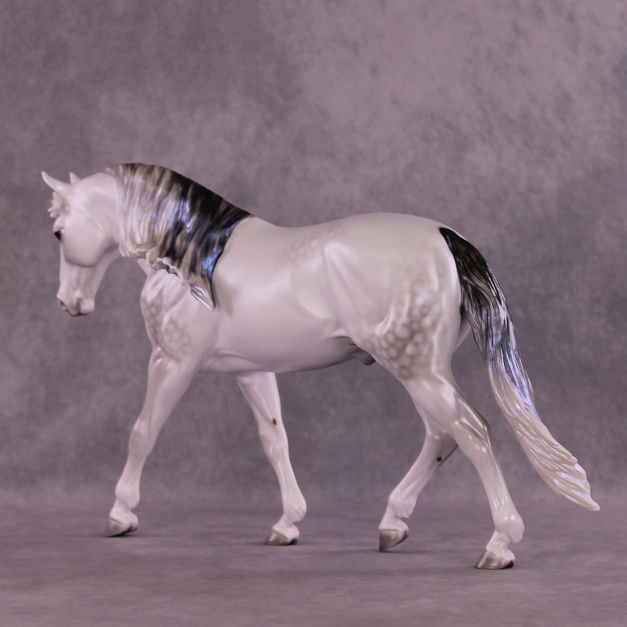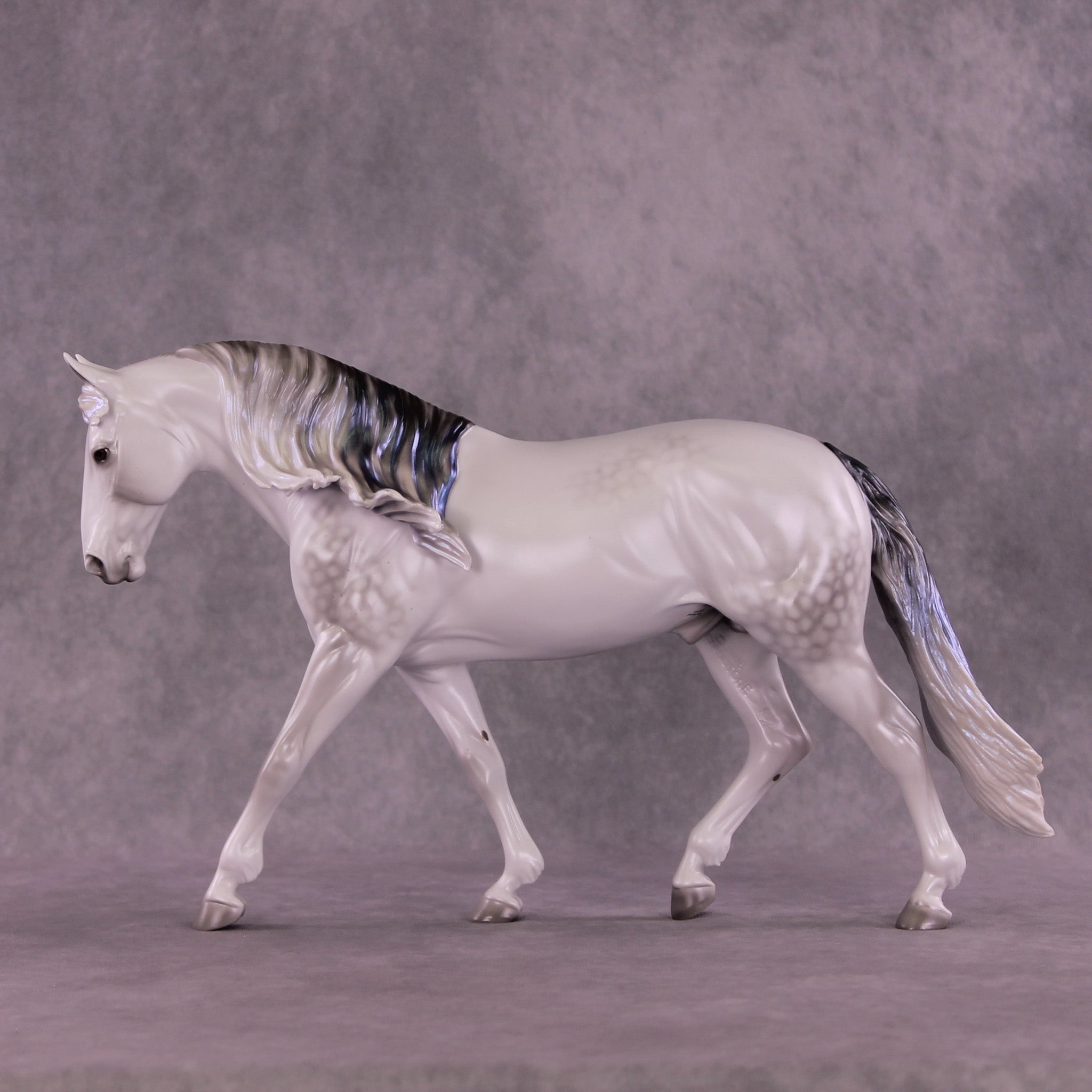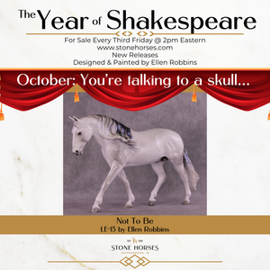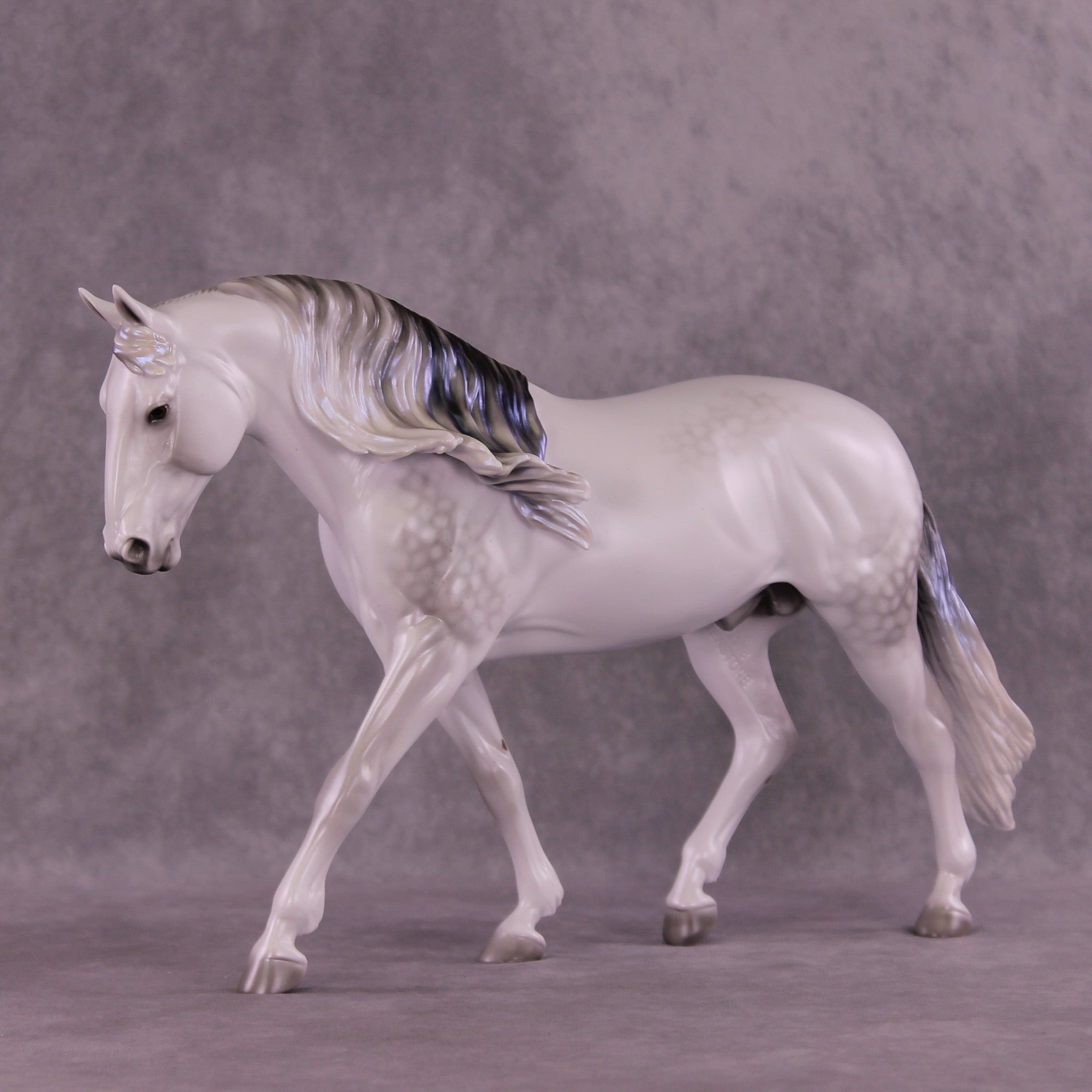 Not To Be represents Hamlet’s father’s ghost, in a gorgeous dapple grey with eerie light blue sheen. The blue sheen intensifies with extra finish, so add satin or gloss to this color with care! He is also on our Irish Draught mold, with a long flowing mane and customized long tail.