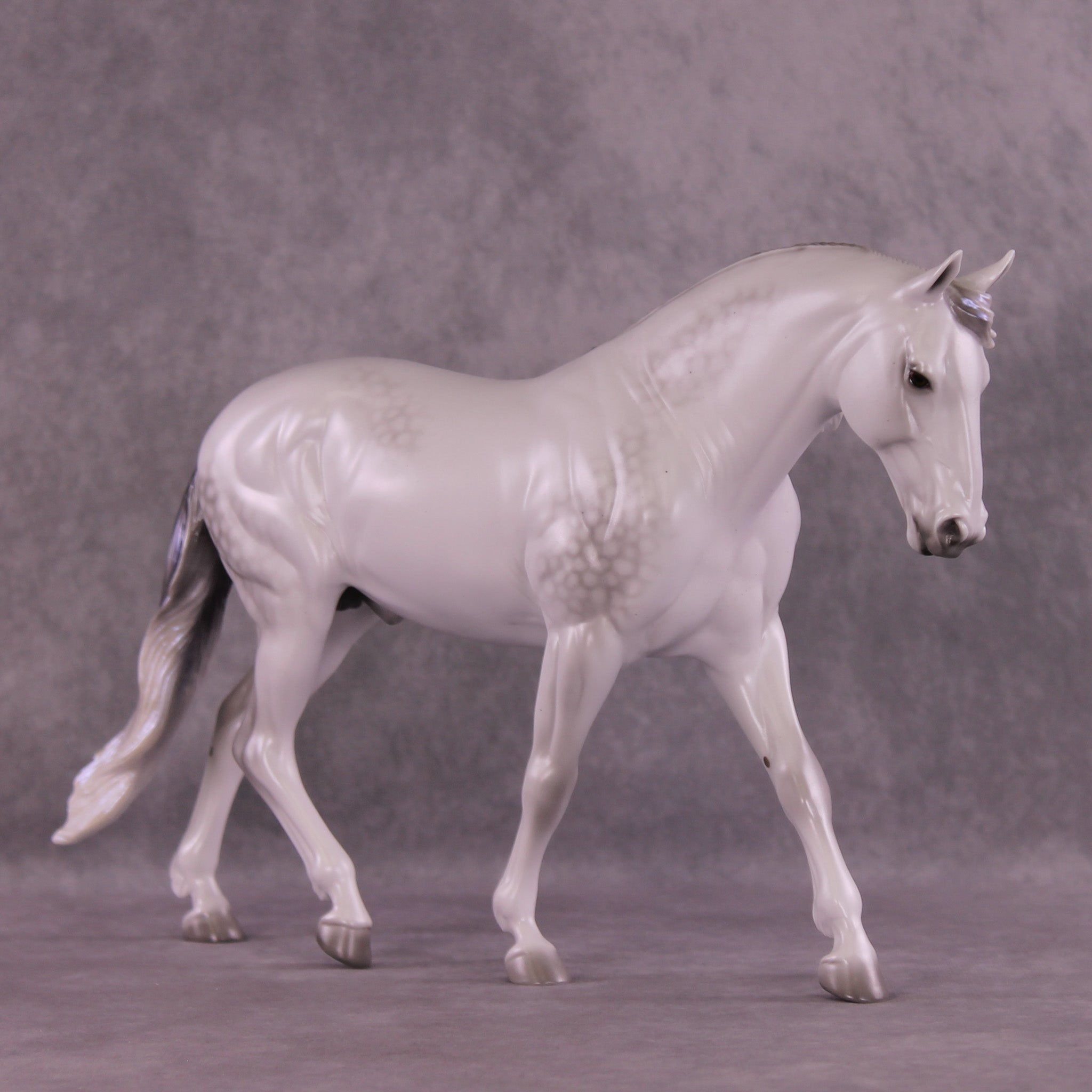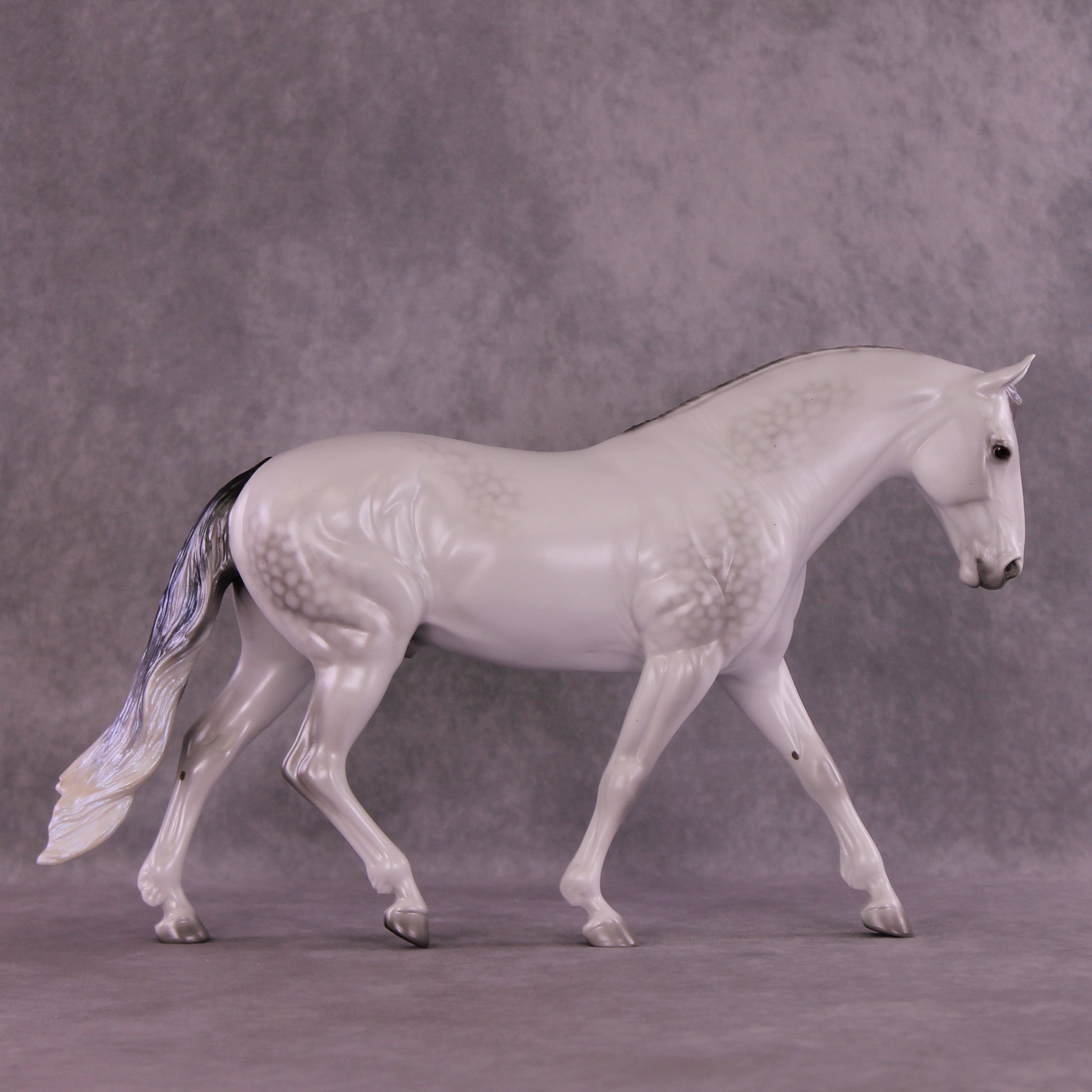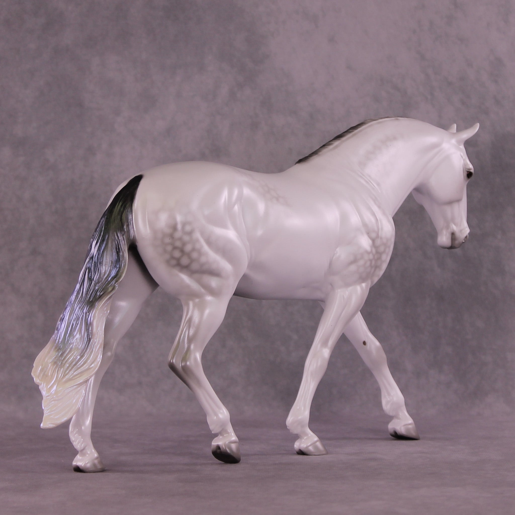 Not To Be represents Hamlet’s father’s ghost, in a gorgeous dapple grey with eerie light blue sheen. The blue sheen intensifies with extra finish, so add satin or gloss to this color with care! He is also on our Irish Draught mold, with a long flowing mane and customized long tail.