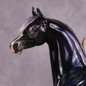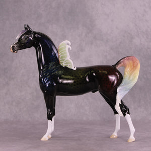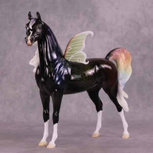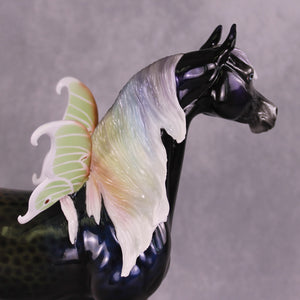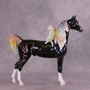 “Oberon” is a partner piece to this week’s Classic Literature series, and he was first customized by Matt to have an extra long waving mane and tail, plus customized fantasy wings in the style of the ethereal Luna moth. Ellen painted him to a stunning ombre rainbow dappled black – the dimension in this piece is very hard to capture in photos, and in person he SHINES! He comes in glossy finish and no finish changes are offered on this piece.