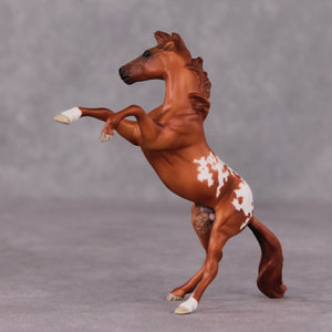 “Occhiali” is painted to a stunning red chestnut extended blanket appaloosa with two socks and beautiful soft shading, especially through his legs and super detailed striped hooves.