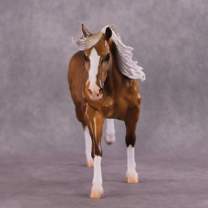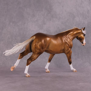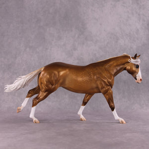 “Jaxson” is the last Remington of this group by Caroline Boydston and Mona, and they are going out with a bang. He has Mona’s signature extra-detailed tendril heavy mane, tail, and forelock – combined with Caroline’s toasty golden dappled palomino finish work. Caroline gave him four tall white socks and a big blaze, he is a champion reining horse in model form.