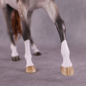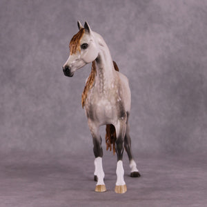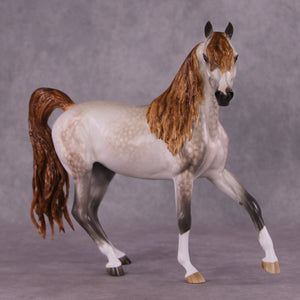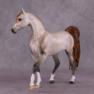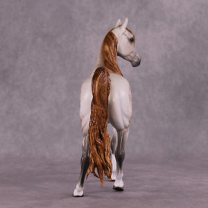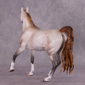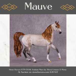“Mauve” features our Arabian mare sculpture with a gorgeously customized mane, tail, and forelock with keyhole detailing and extra tendrils and volume by Mona. Sheryl then painted her to a stunning dappled mulberry grey with a firey shaded mane and tail and loads of details throughout.