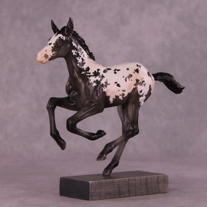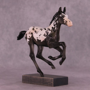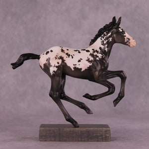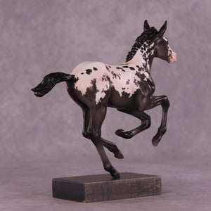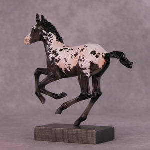 Is this not the sweetest baby! This Pimento has had her ears customized to one forward and one listening, and Erika has painted her to the most stunningly detailed shaded baby black extended blanket appaloosa. She has delicate pinking, beautiful warm tones especially through the shading in her legs, and she is ready to scamper into your collection.