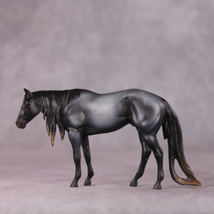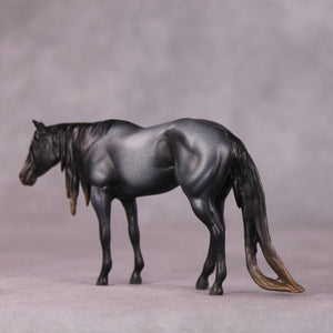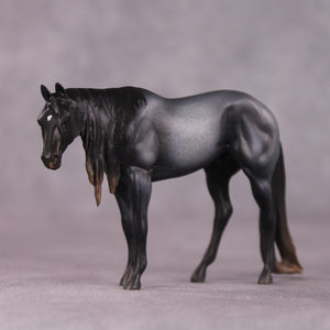 “Outside Dave” is one of the more extreme models in this bunch. Amanda dramatically lowered and slightly turned his head, and raised his topline to match, and then gave him a super long and tendrilled mane, tail, and forelock with keyhole detailing. She then painted him to a delicious deep blue roan with loads of dramatic shading and a tiny star. A real standout!