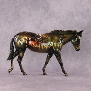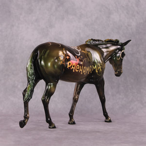 “Pachamama” means ‘Mother Earth’ in Quechua. In Incan mythology she is an ‘Earth Mother’ goddess, and Kike has brought her energy into this model in an unbelievably unique and amazing way. The goddess herself is depicted on one side of the model with her name on the other, all woven together with natural elements using an incredibly innovative layering technique that Kike is pioneering here at Stone Horses. This large mule is beautiful and moving in all the ways a work of art should be.