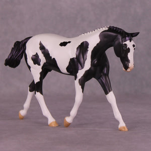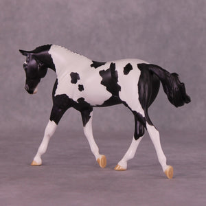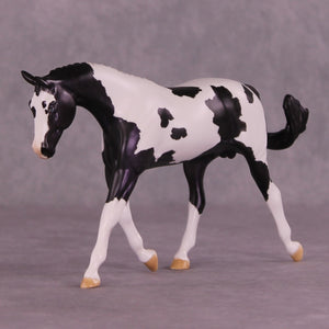 The realistic design is a lovely shaded dappled black pinto with beautiful blue eyes, and the pebble and chip both have lavender ribbons in their hunter braids! This design features subtle interference purple and blue sheens especially in the mane and tail, staying realistic but with that freshly show-sheened black horse shimmer.