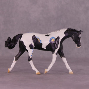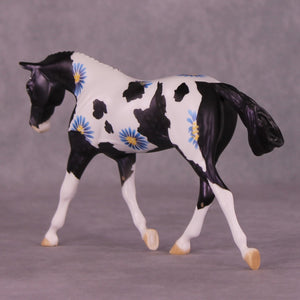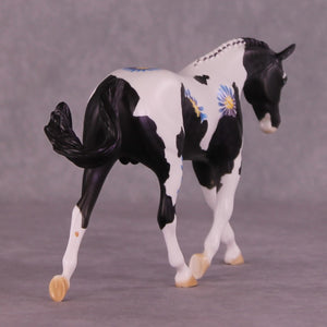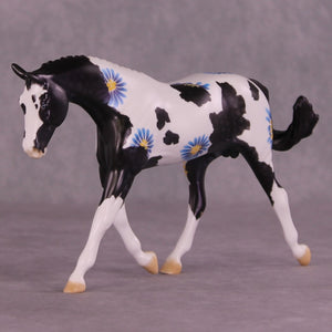 The decorator design is the same dappled black pinto with blue eyes, with even more blue and purple shimmer, plus beautiful delicate aster flowers peeking from behind portions of the pinto pattern. This design is a unique blend of realism and decorator styles!