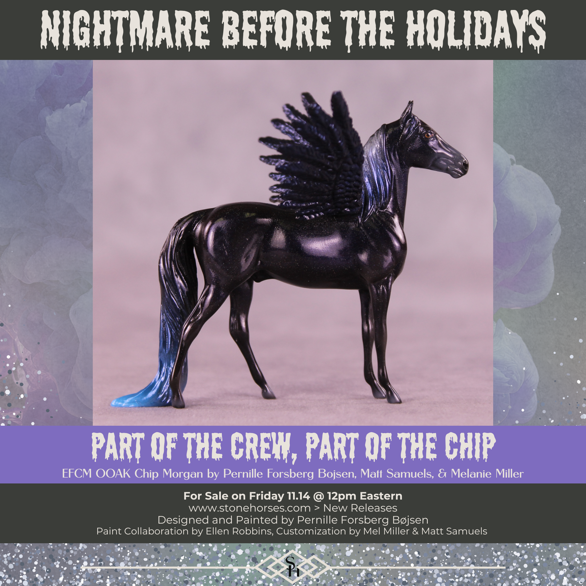 Part of the Crew, Part of the Chip is a Morgan Chip with an extra long customized dragging tail and added feather wings. He is inspired by the Rook, in shaded black holographic with blue shading, finished in gloss.