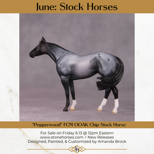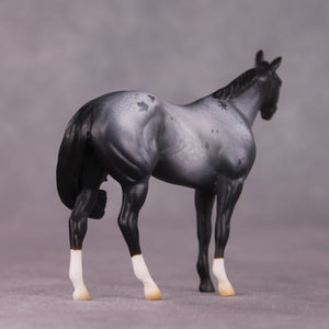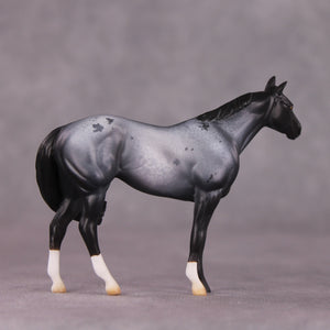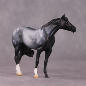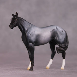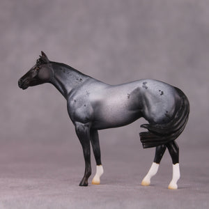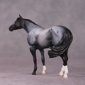 “Pepperwood” has a show style customized swishing tail with a banged bottom and extra hair texture, and then Amanda painted him to a stunning detailed blue roan with corn spotting and three white socks. A lovely quarter horse class winner!