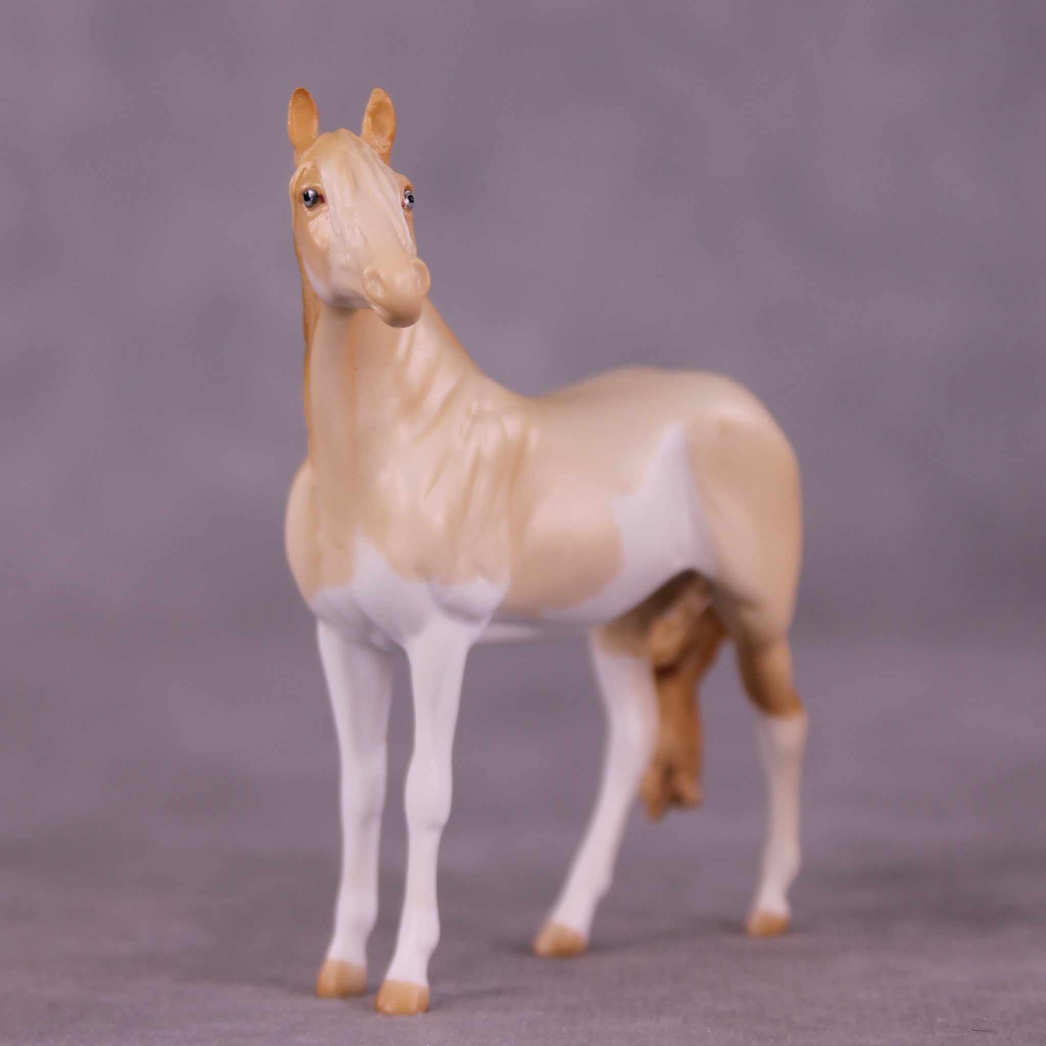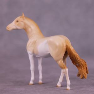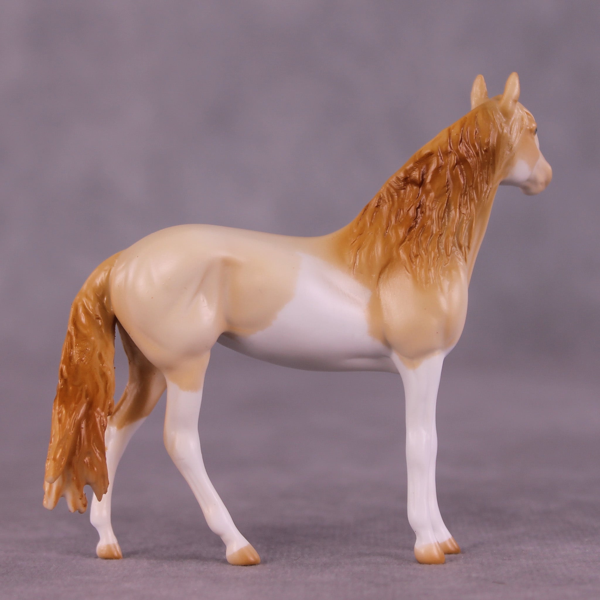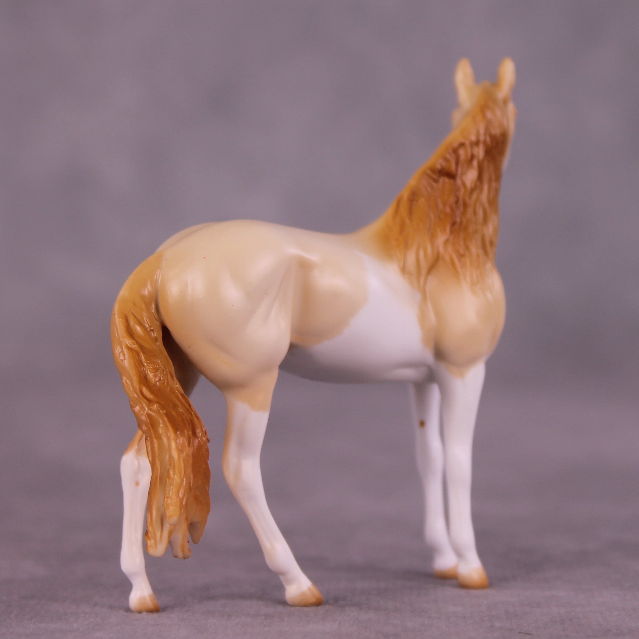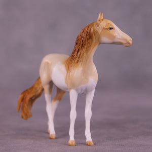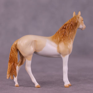 Pick Me doesn’t really like ‘girlie things’ and isn’t friends with too many other mares, they cause too much drama – but that’s OK, we love her just the same. For this piece, Mel began with our Chip Andalusian mold and first customized her to a mare at Tegan’s request to celebrate and honor her transition as a transgender woman! She then got a haughty head lift and turn, added detailing in her mane, and a sassily swishing tail. Tegan painted her to a gorgeous perlino splash pinto with just the right amount of shading and detailing throughout, finished with lovely blue eyes! Finish changes are not available on this piece.