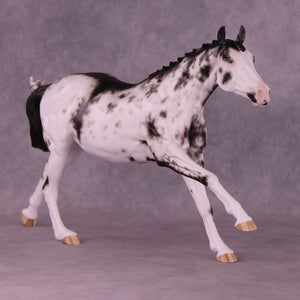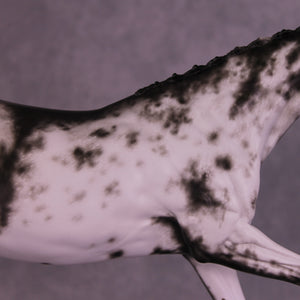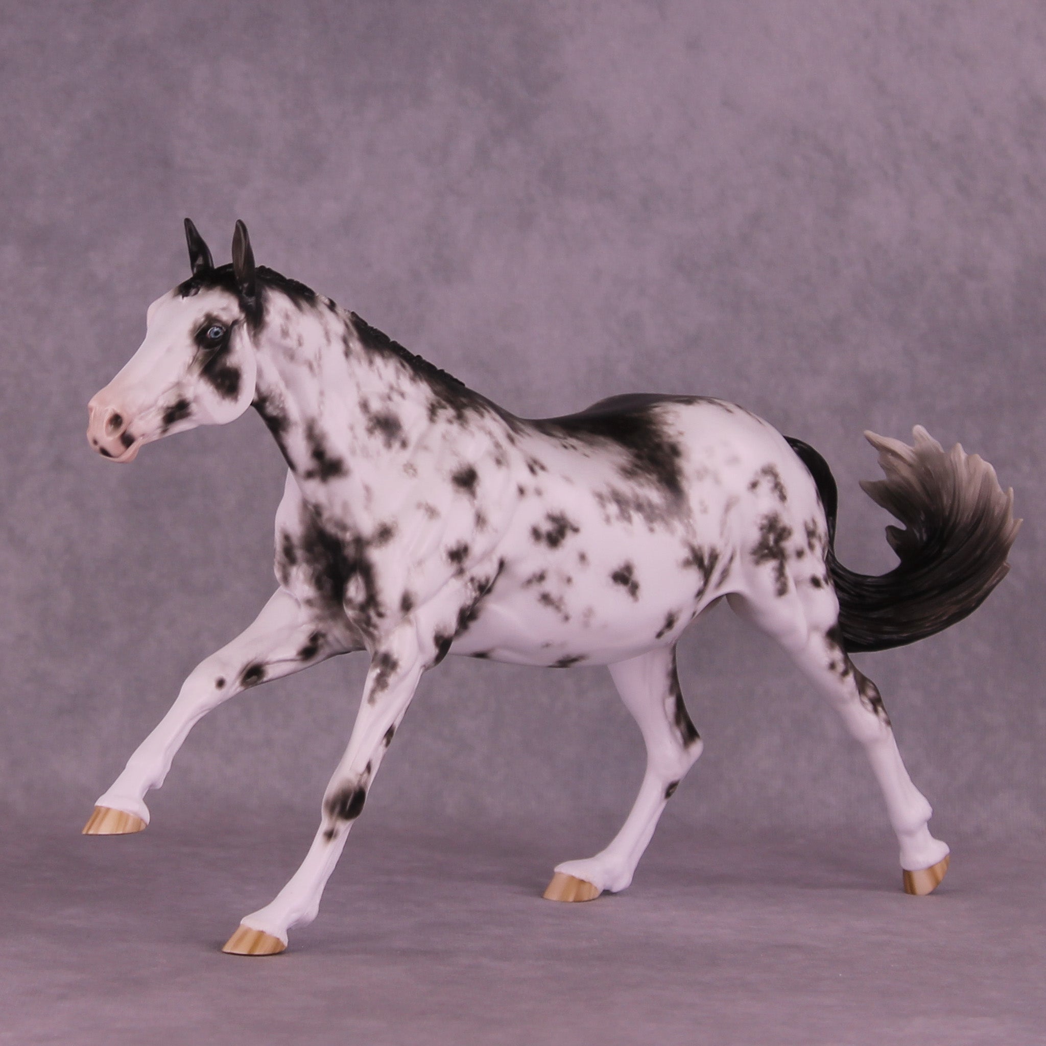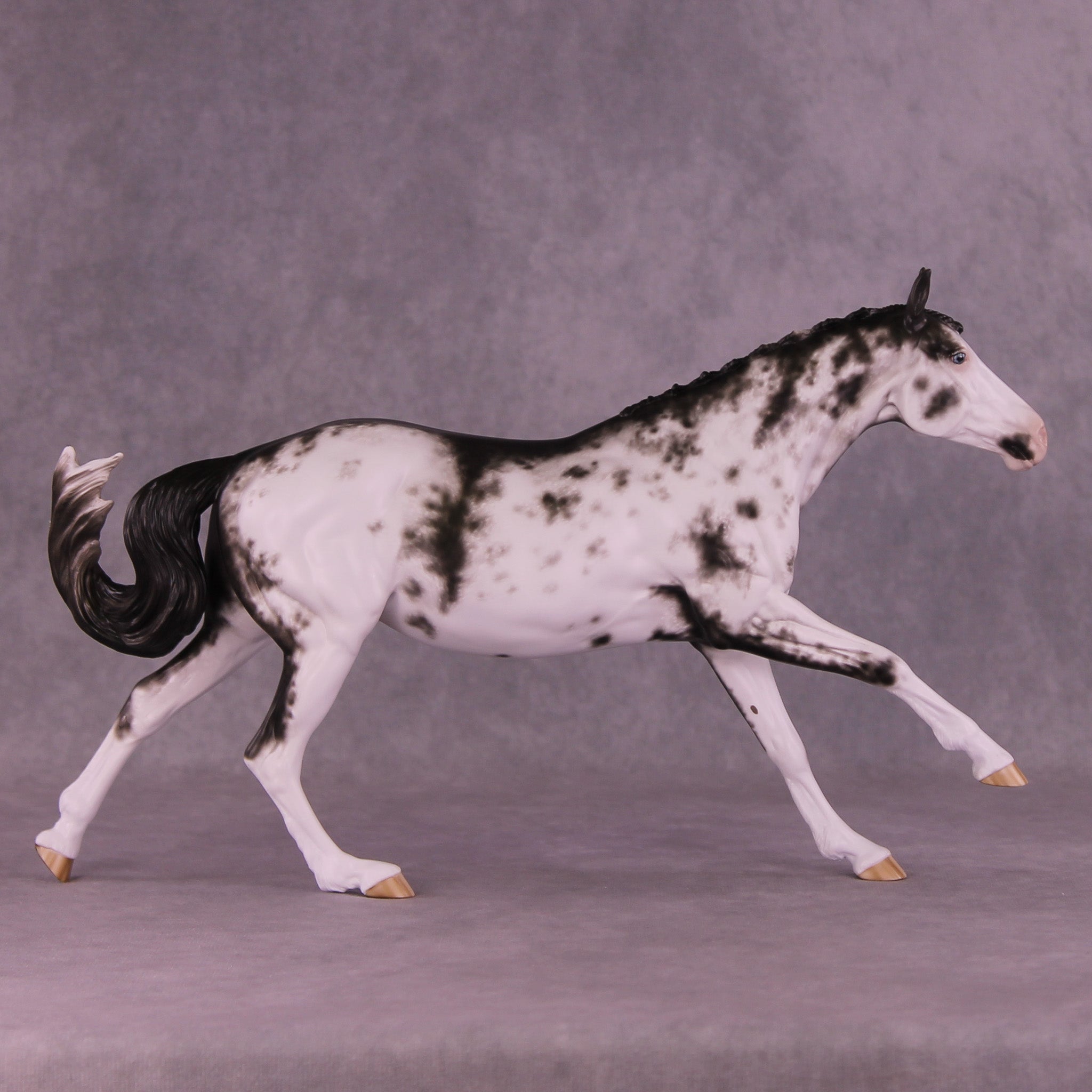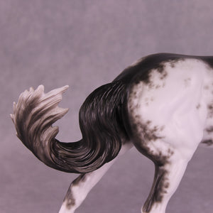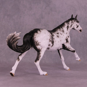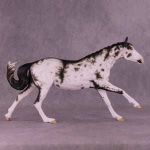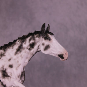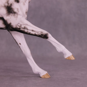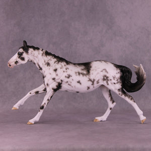Volo is ready to win! She has been customized with clipped ears for show, one facing forward and the other in a listening position. She sports a lovely braided mane with swirling active tail that balances out her extended canter perfectly. Sheryl painted her to a mind-blowingly detailed black sabino with striped hooves and Sheryl’s signature balance between hair detailing and in-scale softness through this whole design. She is just stunning.