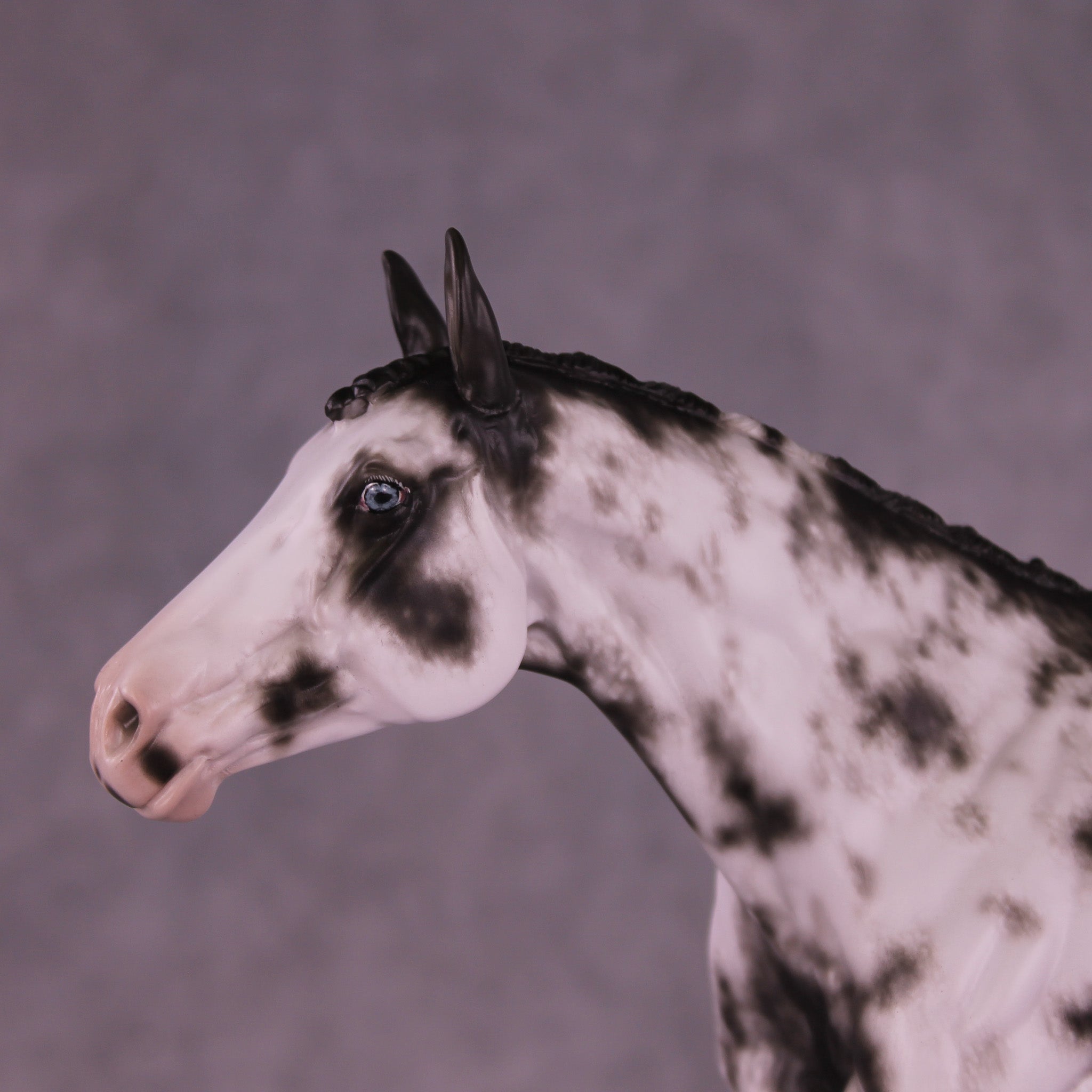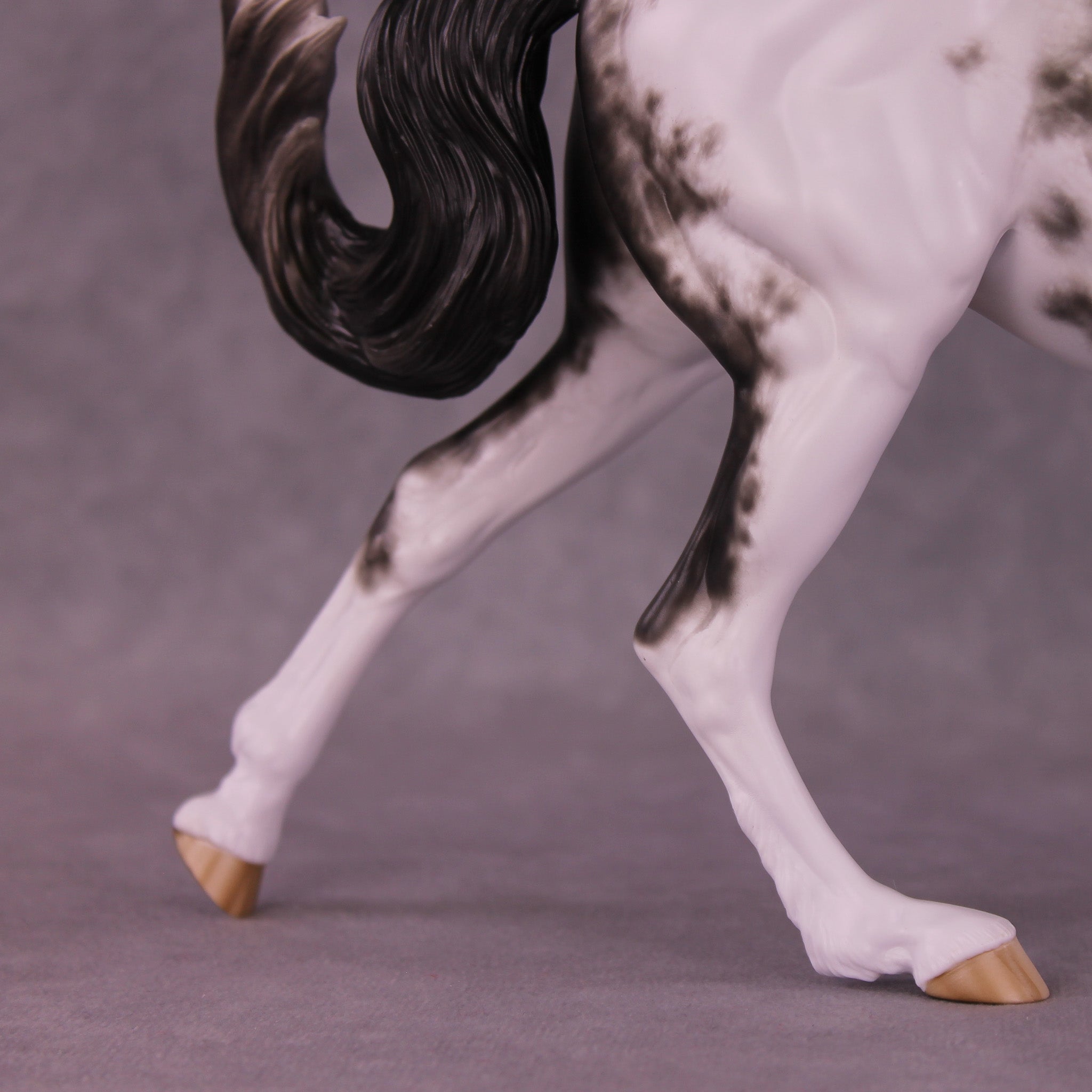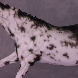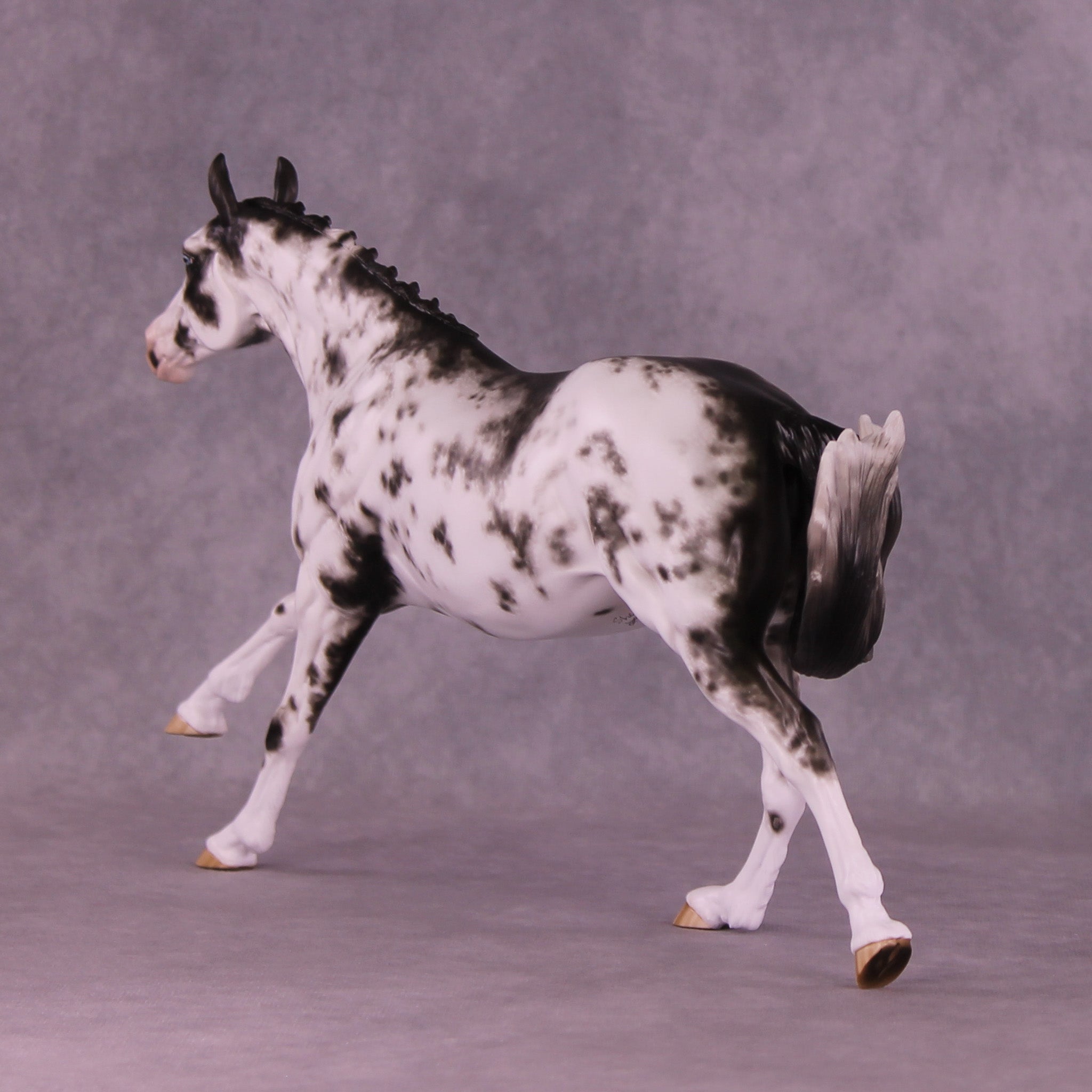 Volo is ready to win! She has been customized with clipped ears for show, one facing forward and the other in a listening position. She sports a lovely braided mane with swirling active tail that balances out her extended canter perfectly. Sheryl painted her to a mind-blowingly detailed black sabino with striped hooves and Sheryl’s signature balance between hair detailing and in-scale softness through this whole design. She is just stunning.