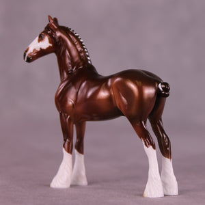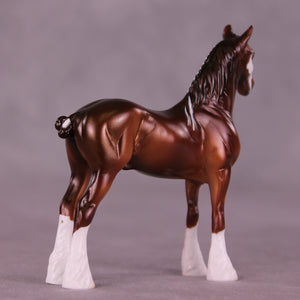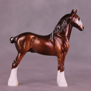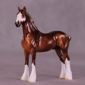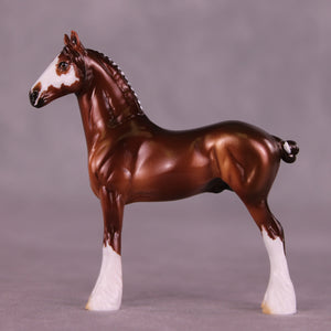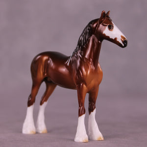 Poor Yorick is a bright chestnut with white ribbons, with matching realistic wide face marking that resembles a skull if you look carefully.