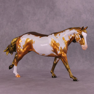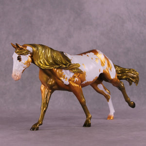 Heza Spice Train is on our long mane Remington mold and features the same pinto pattern but in shades of gold and sparkly bronze with coordinating brown eyes to usher in fall with style. He comes in glossy finish only and is priced at $484.99 including finish, in a limited edition of up to 30 pieces to be produced this winter per your orders.