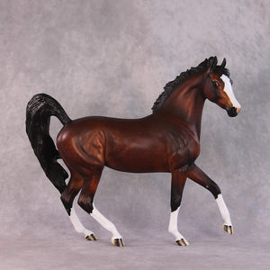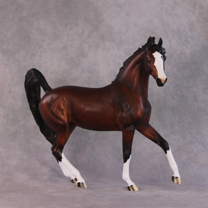 “Red Moon” – realistic heavily dappled red bay with a wide blaze and four white socks, $399.99