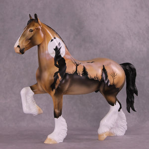 Through the Mist, the decorator design, is the same heavily dappled sooty buckskin, with a mural style depiction of a misty shadowed werewolf design to usher in Spooky Season in style!