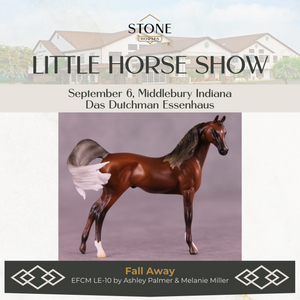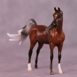 Fall Away is a run of 10 pieces on our Chip Arabian mold. He is a gorgeous customization by Melanie Miller, with a dramatic turned and tucked head and neck, extra detail added to his ears, and a dynamic customized flagged and swishing tail. Ashley Palmer then painted him to a warm shaded bay with gulastra plume and two socks. Just incredible!