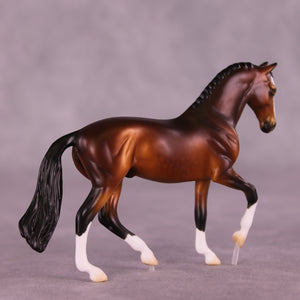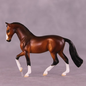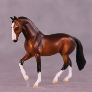 Pumpkin Spice Polka is an EFCM run of 5 pieces on our Chip Warmblood mold. Melanie Miller gave him a classic tucked head and customized his gait into a passage with two clear acrylic pegs to support his floating movement. Ellen took a page out of Dressage Monthly and painted him the ideal shaded dappled bright bay with four white socks and a blaze. Please, somebody take this piece to the Olympics!