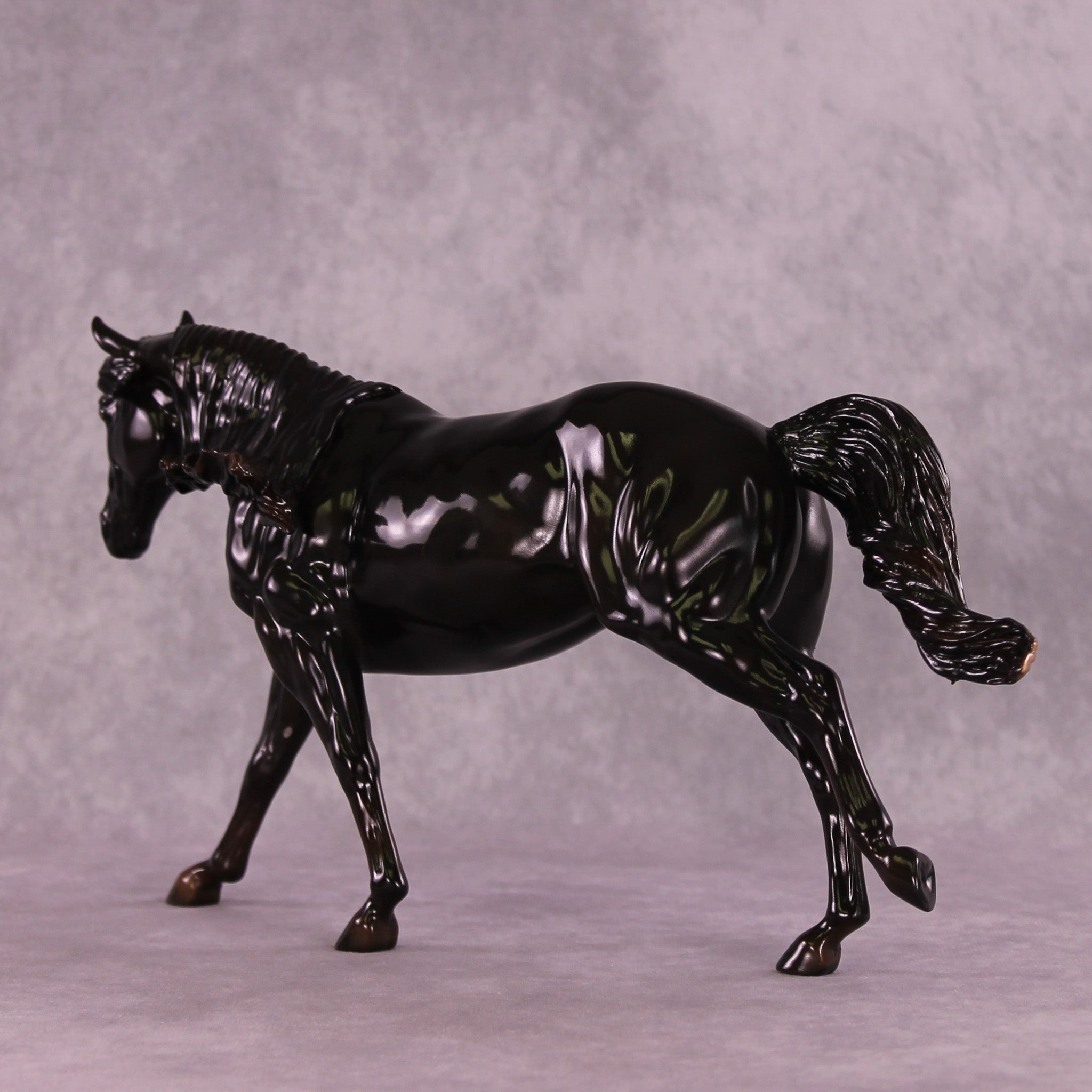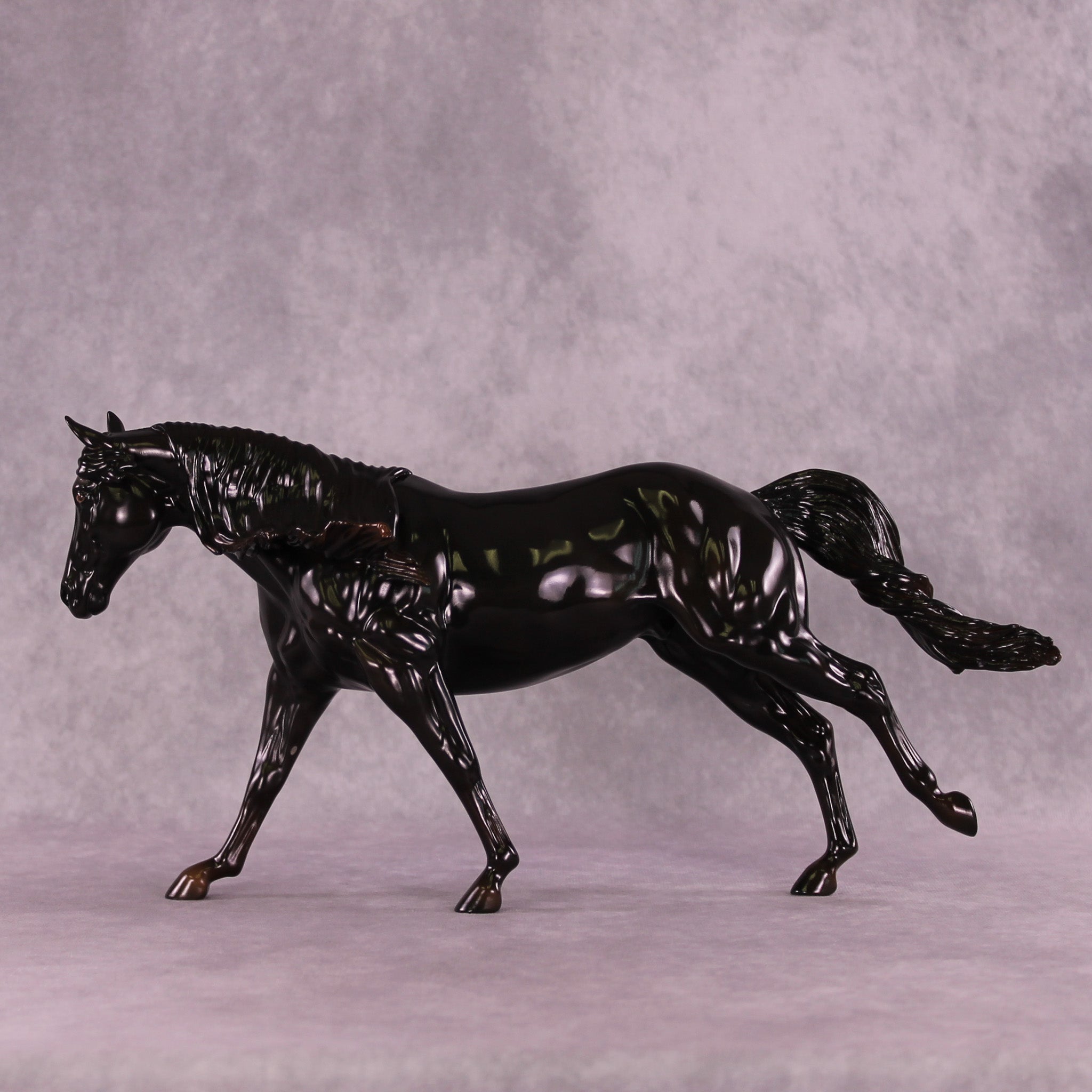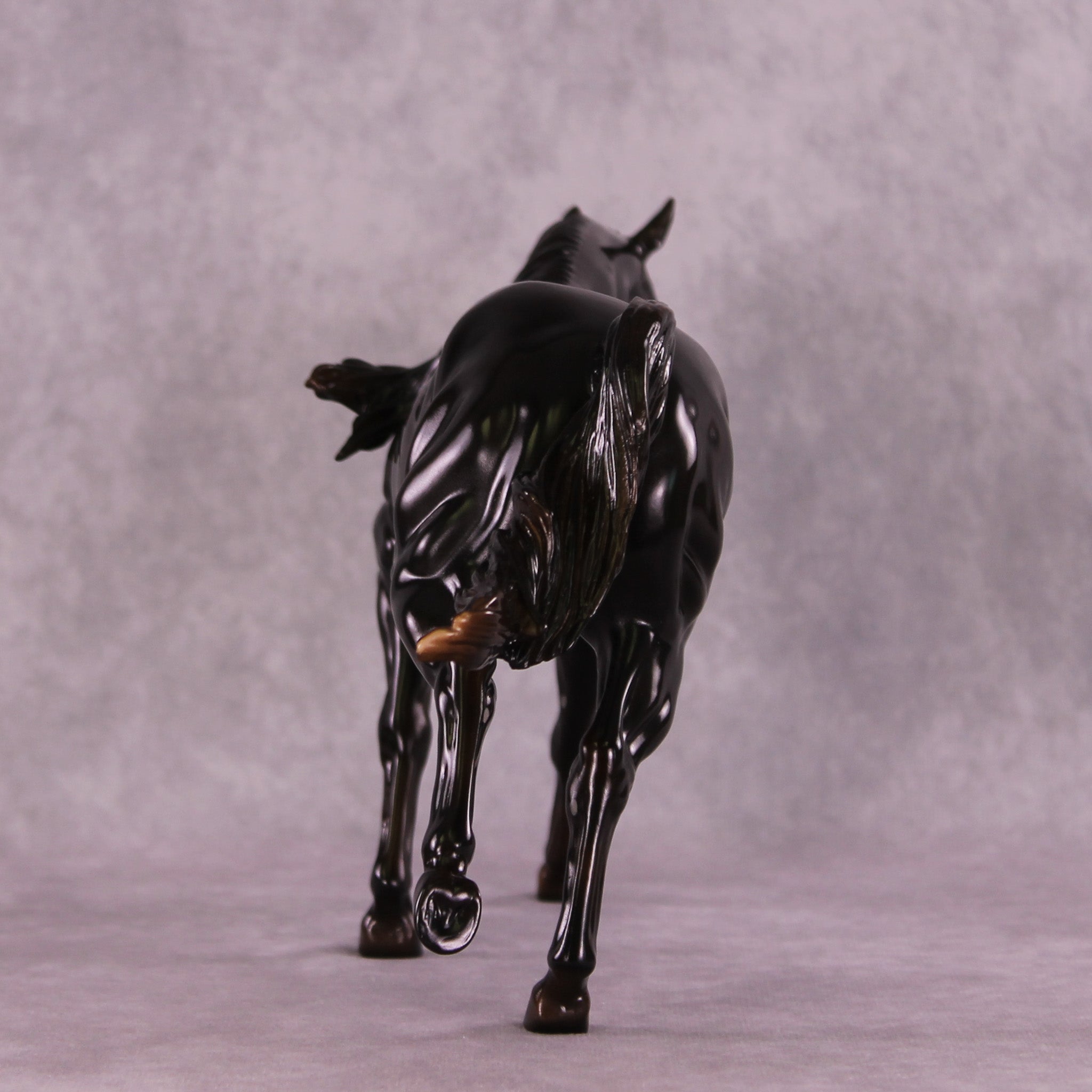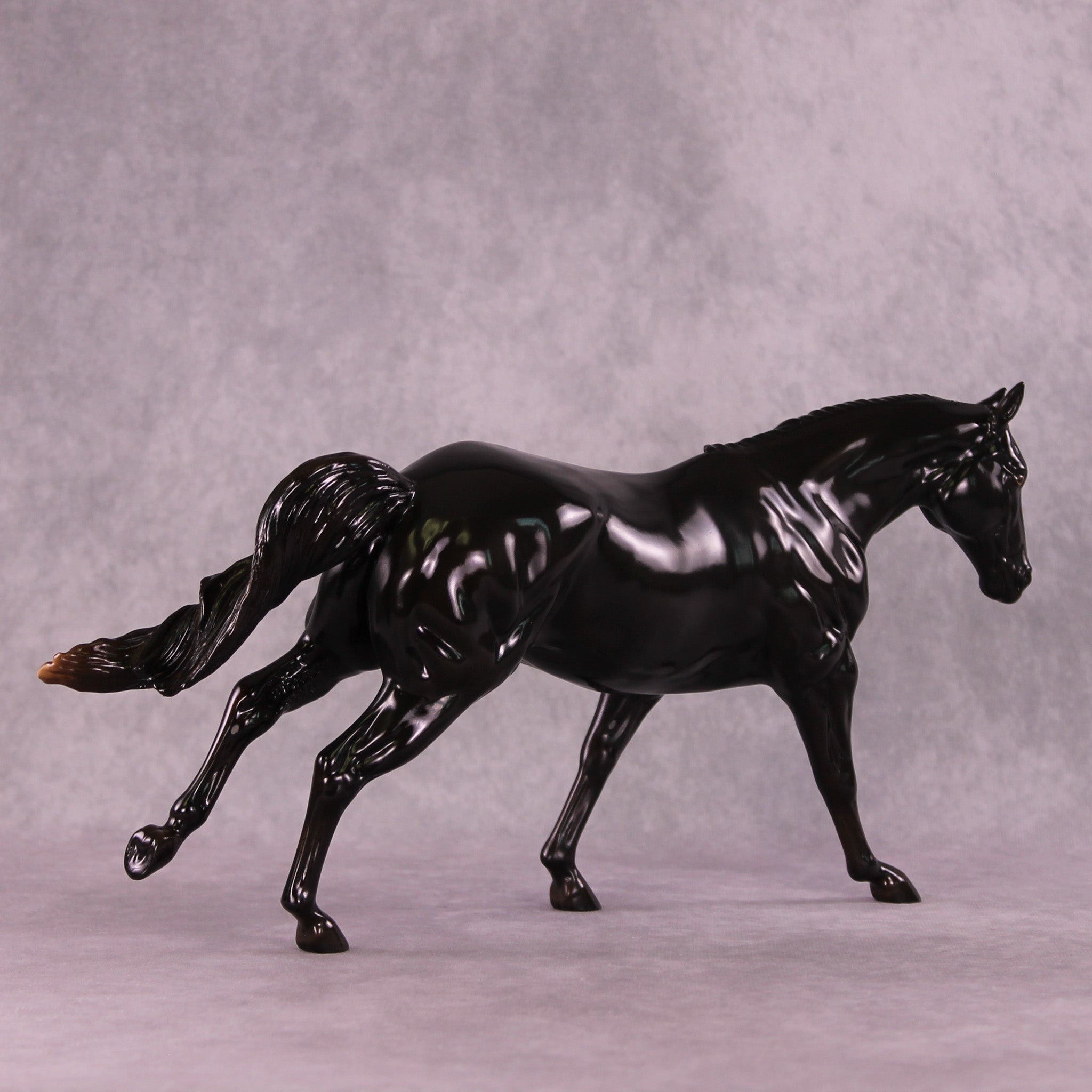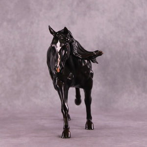 Sometimes the seemingly ‘simple’ colors are the ones that shine the most! This Remington features his long flowing mane, plus a customized windblown tail showing his movement. Erika painted him to a gorgeously shaded sunfaded black with dimension through his whole coat, and an adorable broken blaze. Finished in gloss, this guy is a standout stock horse.