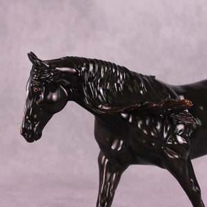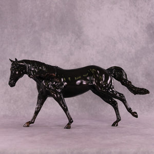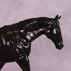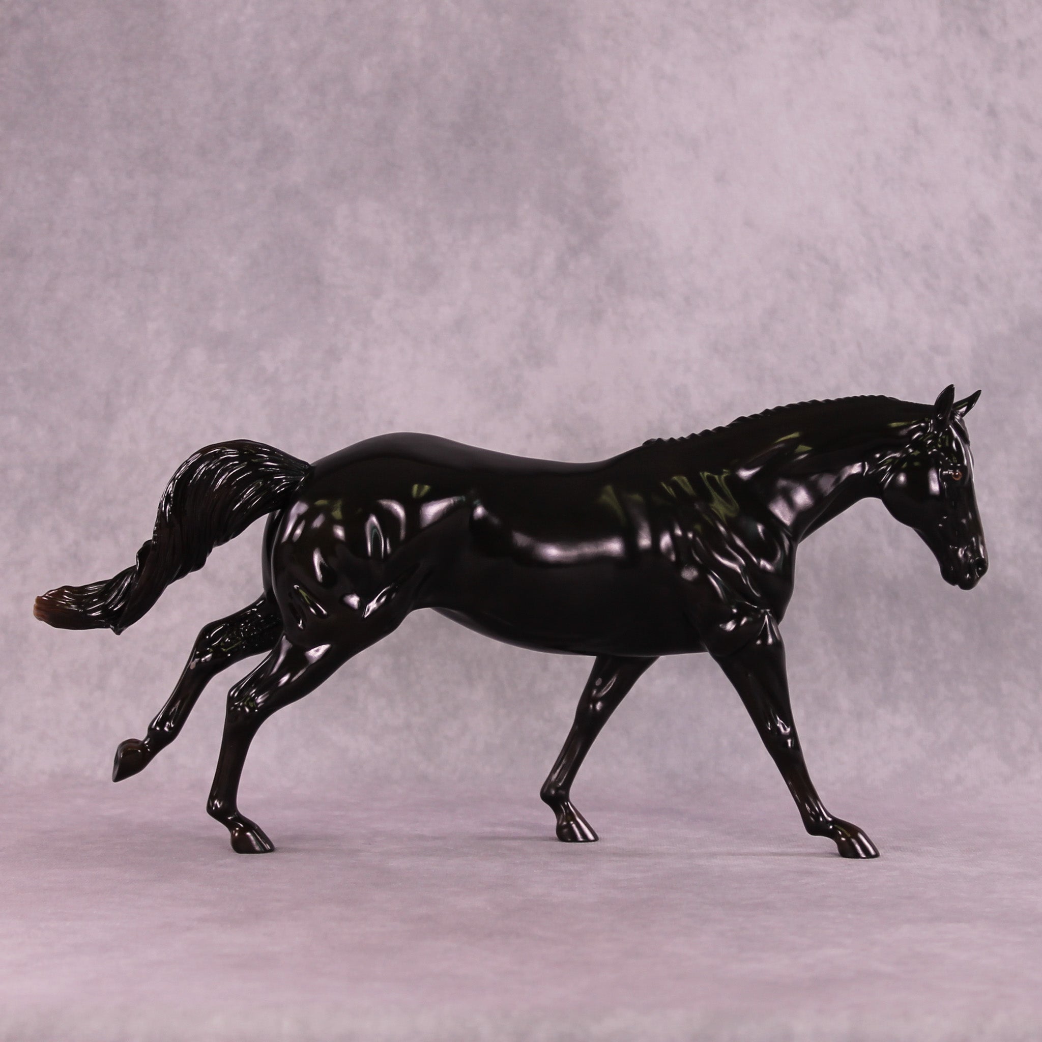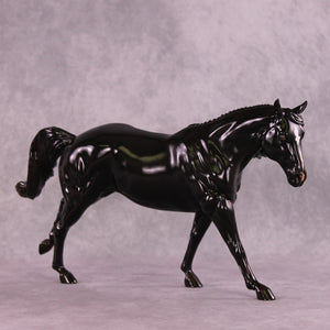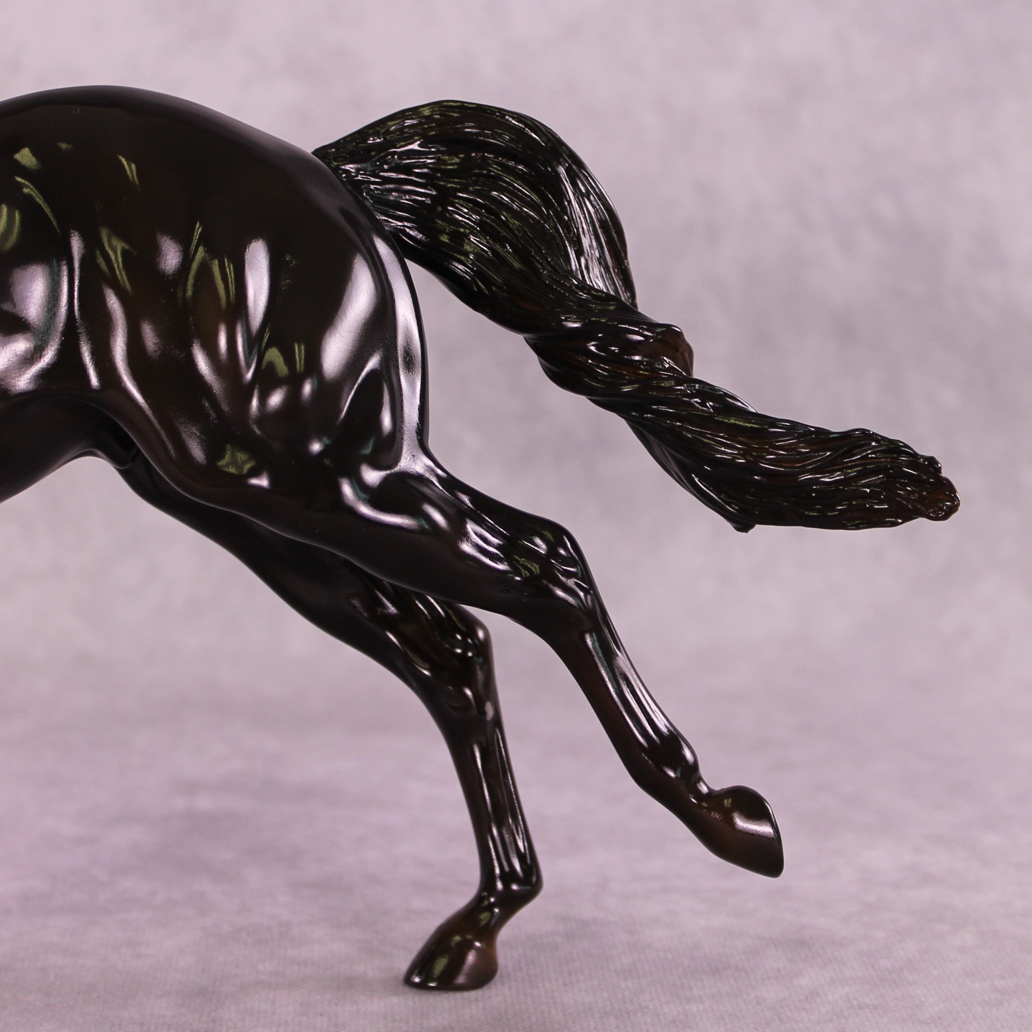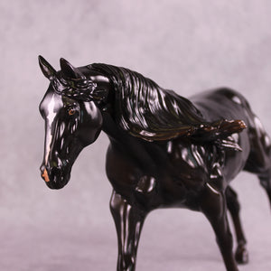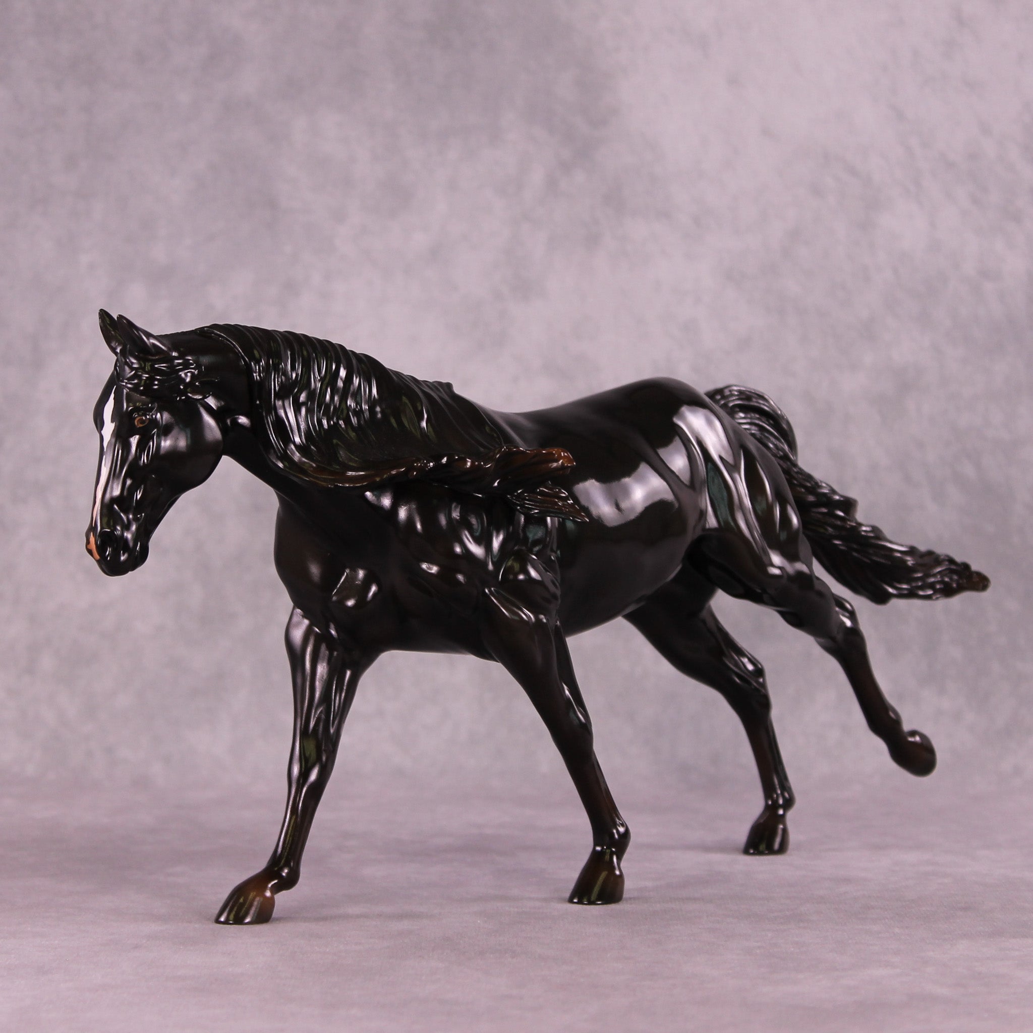 Sometimes the seemingly ‘simple’ colors are the ones that shine the most! This Remington features his long flowing mane, plus a customized windblown tail showing his movement. Erika painted him to a gorgeously shaded sunfaded black with dimension through his whole coat, and an adorable broken blaze. Finished in gloss, this guy is a standout stock horse.