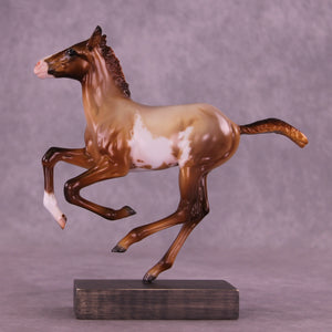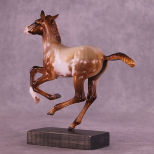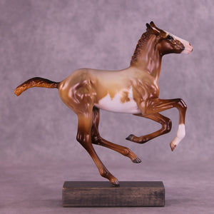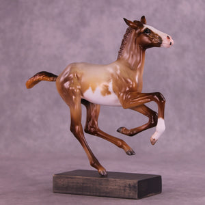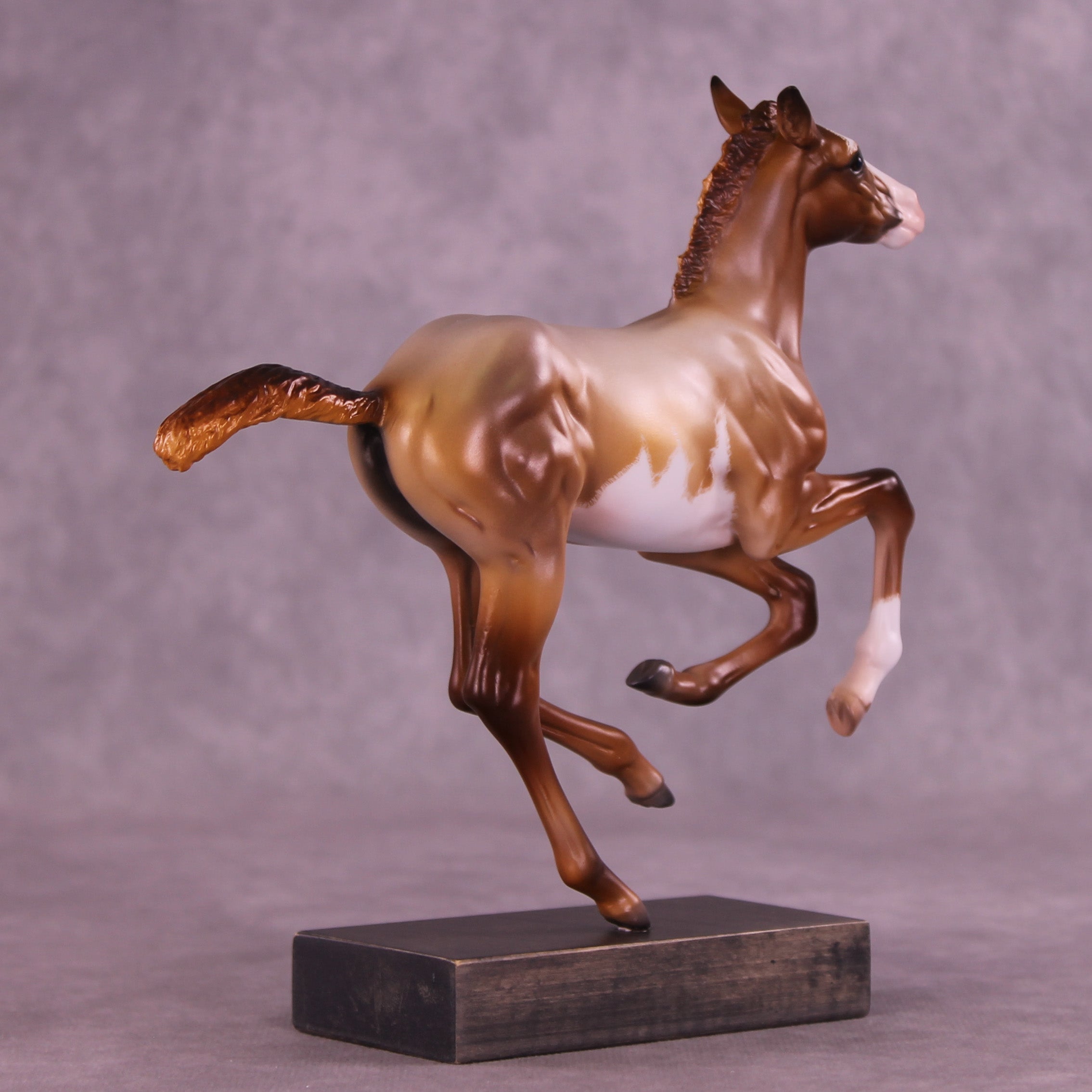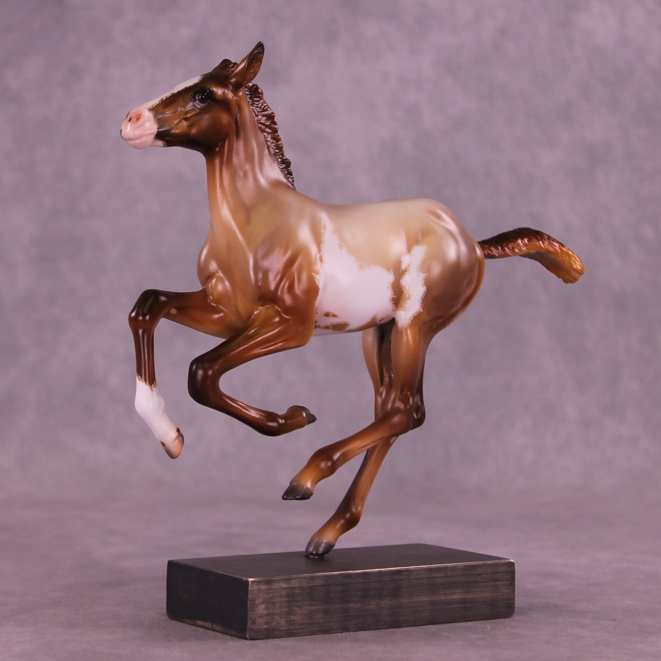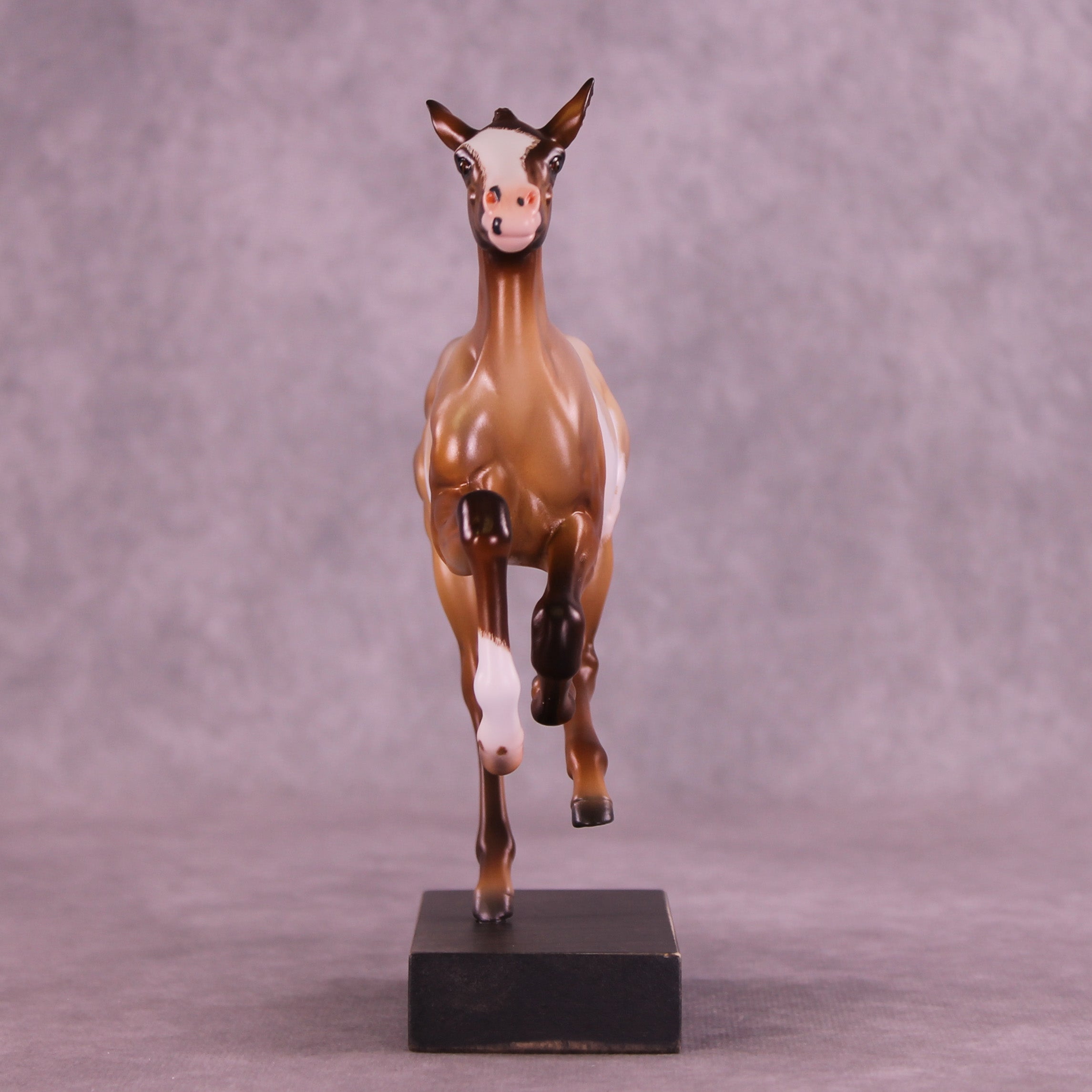 This gorgeous baby has received a new look by Melanie Miller! Mel gave her a sassy uplifted customized head and neck position, a new listening/sideways ear position, and extra detailing in her mane, tail, and ears! Caroline Boydston has painted her to a stunning red roan overo pinto with warm shading and beautiful contrasty detailing through the whole piece. She has etched marking edges as well, and Caroline hand painted her eyes! She is available in all finish options.