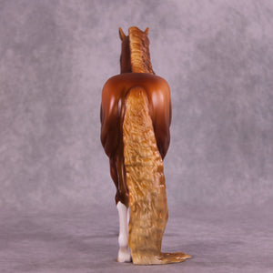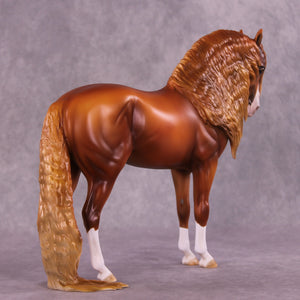 Pumpkin Spice season has arrived! Our ever-popular Andalusian mold features a long, wavy puddle mane, tail, and forelock customization. He’s the perfect canvas for Mindy Berg’s richly shaded chestnut paint job. White socks and face markings contrast beautifully with his warm fall tones—making him the sweetest autumnal Andy.