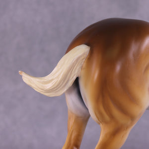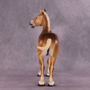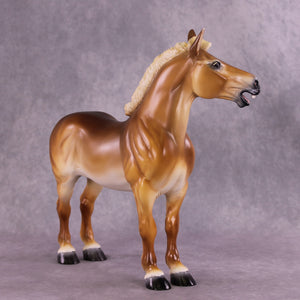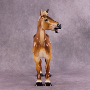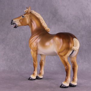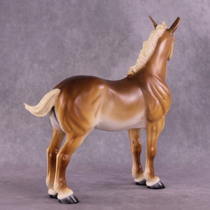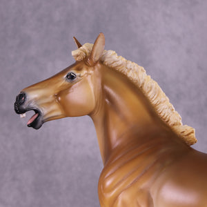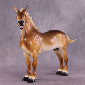 As soon as we got the Standing Draft Horse back into production this year, Tiffany asked us to set aside two of him for her, and we knew she would have some fun ideas for him! This is “Purdy Big John”, Tiffany took our standing draft and turned him into this heavy draft mule gelding with a whole new turned head and neck and head customized into a loud bray. You can hear him from here, trust us! She then painted him to a lovely dramatic shaded chestnut pangaré.