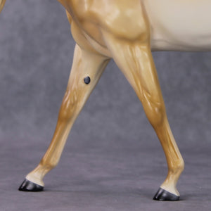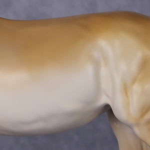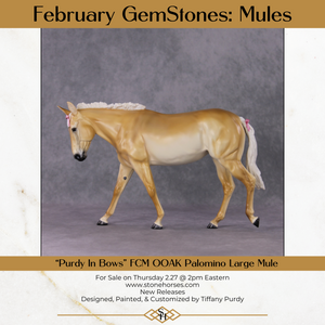 If you ever see a collection Tiffany does for us that does not include something with pink bows on it, call the police or the FBI or both, because there is a pod person situation going on. This is one of Tiffany's signature designs, and we are so pleased to offer her in this collection! Tiffany took our large mule sculpture and customized her head and neck into a subtle turn and tuck, twitched her ear to listen, and - of course - gave her pink bows. The bows themselves are extraordinarily well done, you can see daylight through the loops! Super refined but strong in our OF Plastic, you can't get durable details like this in other materials. Tiffany finished her in an iconic golden shaded palomino - this piece screams Tiffany and we know whoever winds up with her will be thrilled!