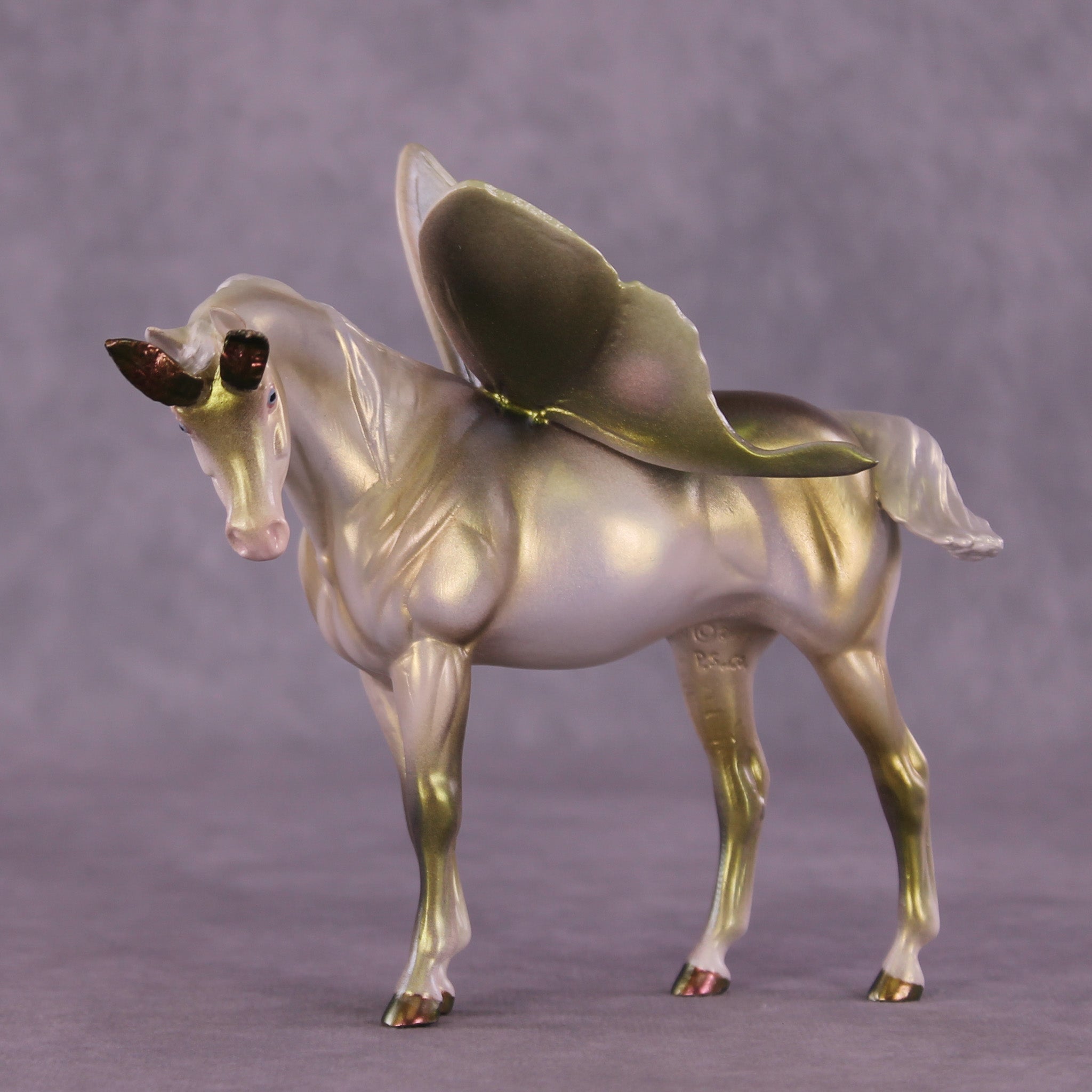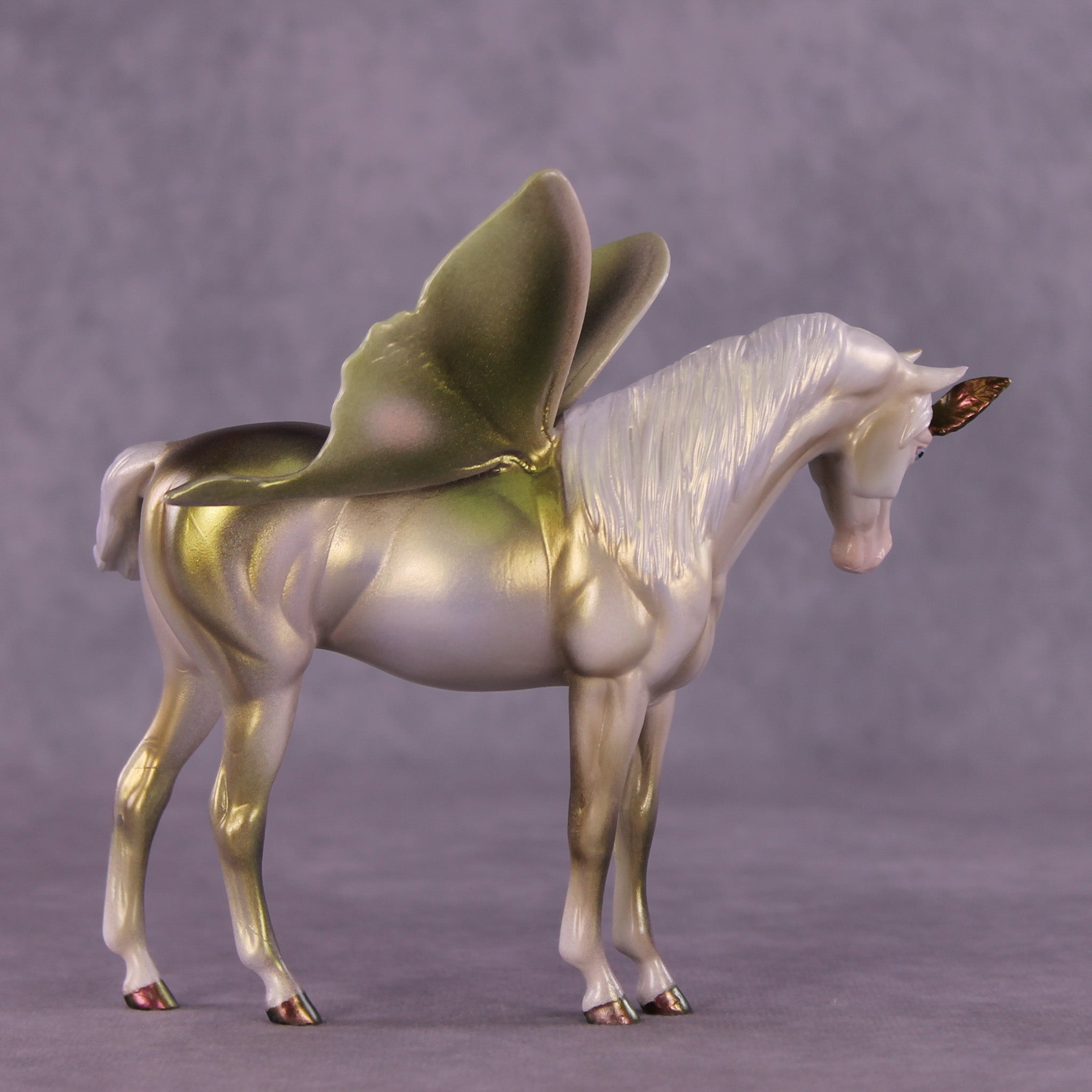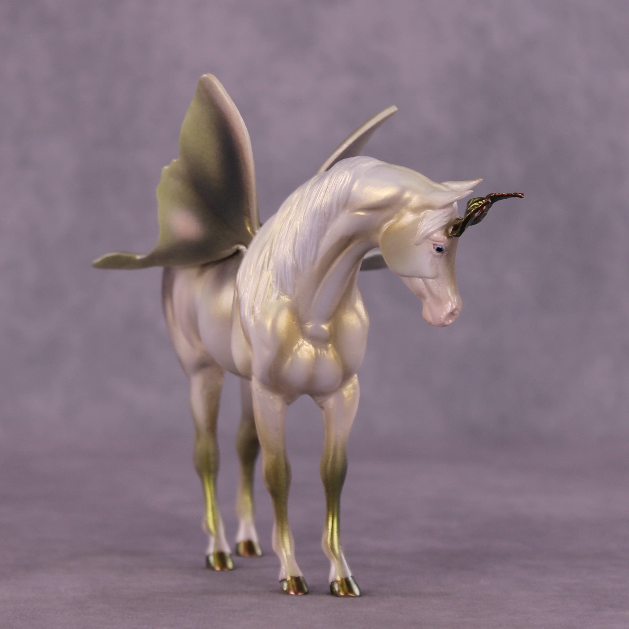 This piece is a fantastical re-imagining of our Pebble Arabian mold, featuring hand-customized moth style wings and fuzzy antennae, plus a customized head and neck position. Tiffany painted her to an ethereal pearl mossy green with interference shading throughout. Something different and refined for those Pegasus classes!