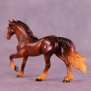(pursued by a bear) represents the iconic stage direction: exit, pursued by a bear. He is a gorgeous shaded dappled red chestnut on our Chip Friesian.