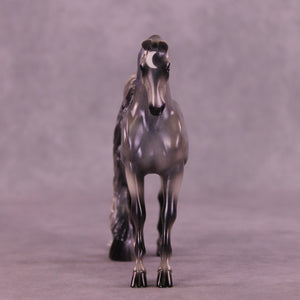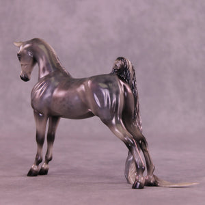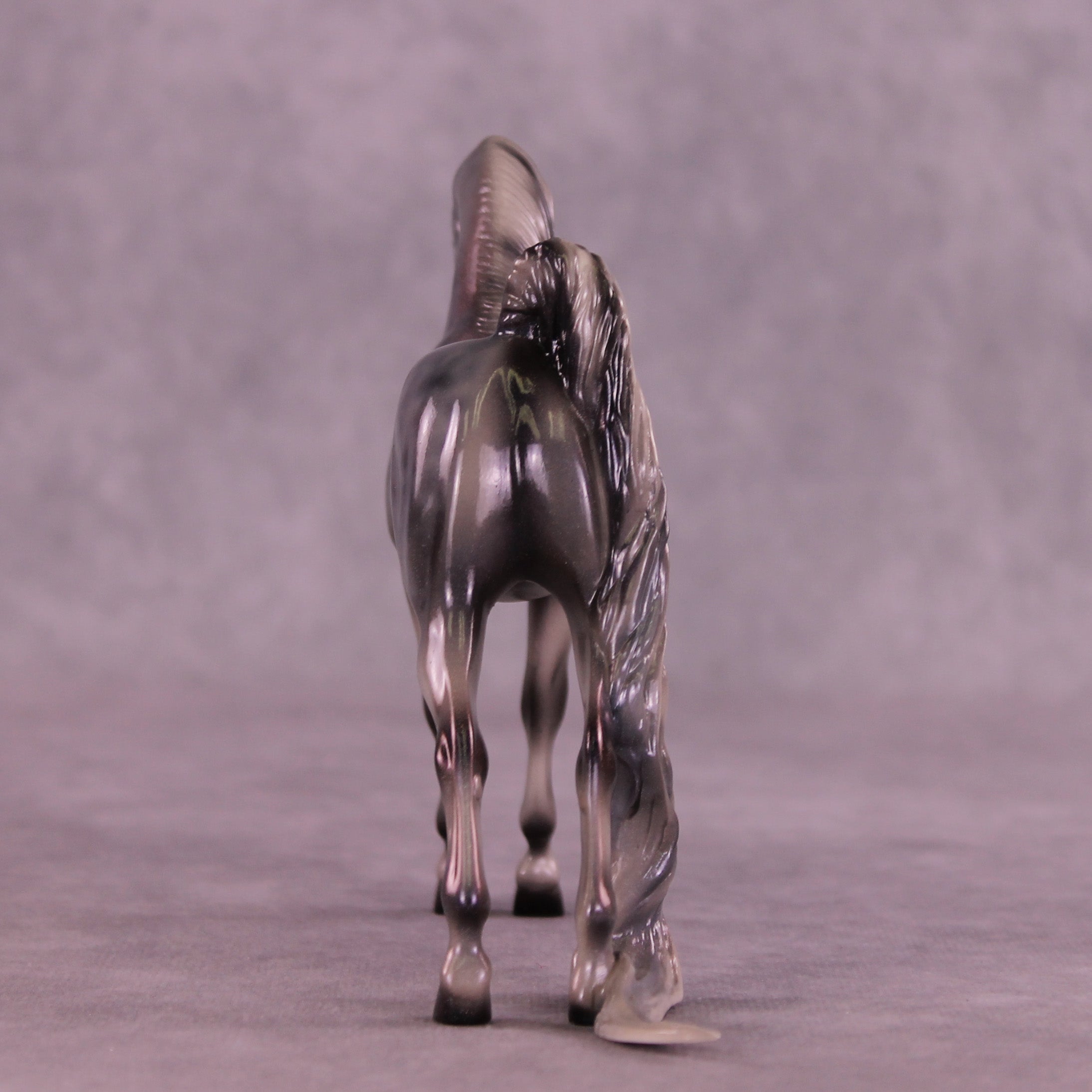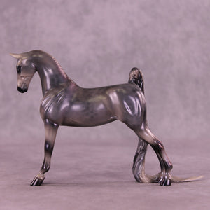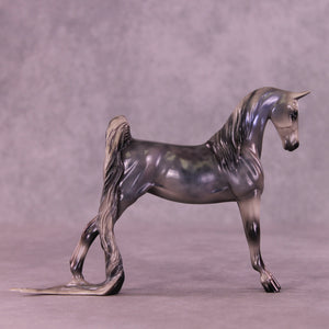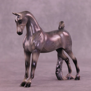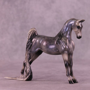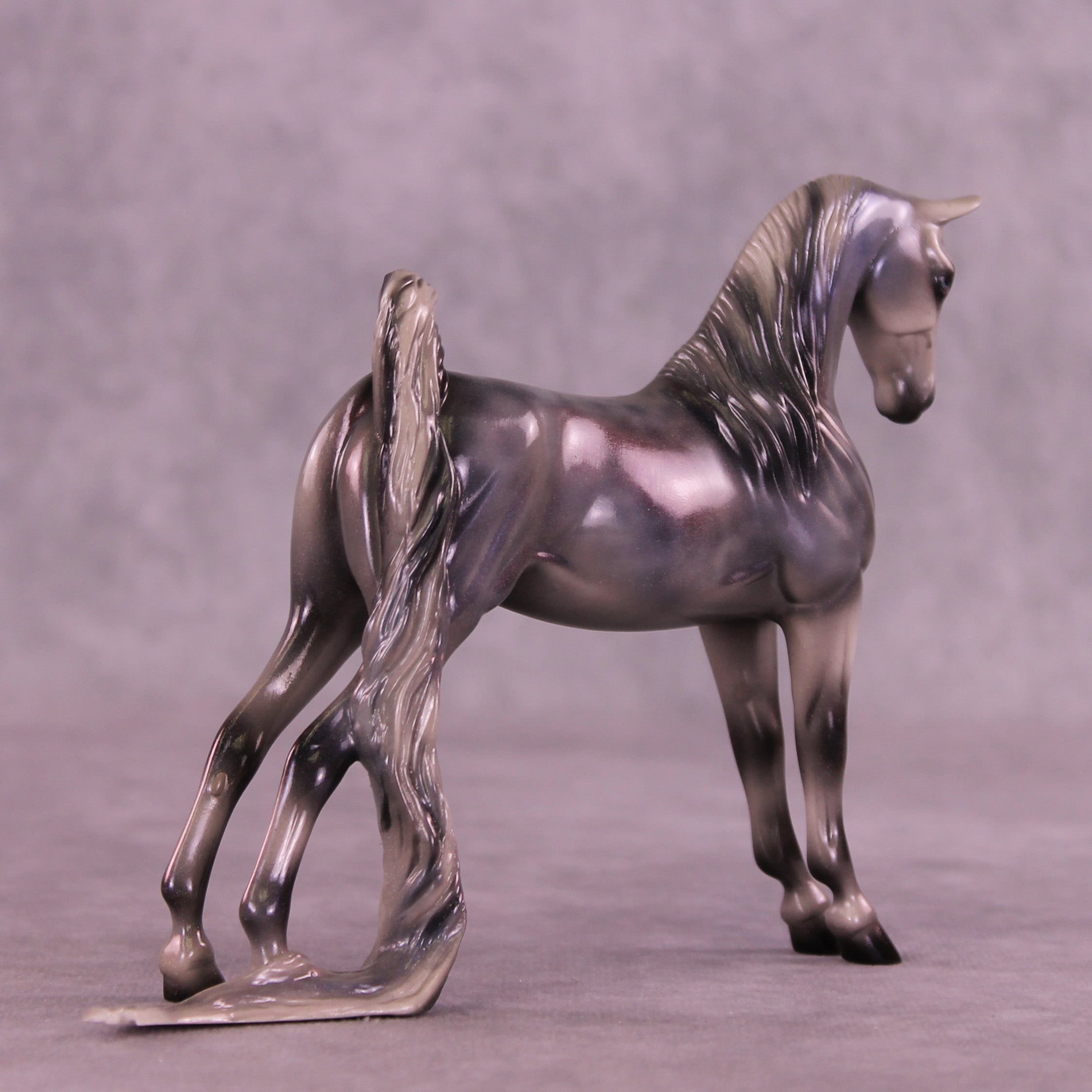 Quikzilver is a Pebble Saddlebred with a silvery reverse dapple grey coat. She was extreme customized by Melanie Miller with a long tail dragging on the ground, customized mane, and a dramatically tucked head. She really sports the show stance to perfection. She is topped off with a thick layer of purple holographic and finished in gloss.