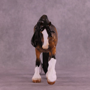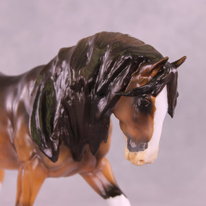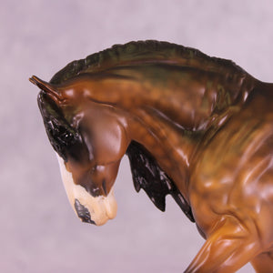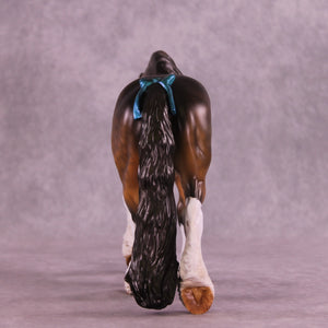 Kristen worked with our Irish Cob sculpture, first customizing her to a mare! She has a whole new head and neck position into a straightened tucked pose, plus a whole new customized mane, forelock, and wavy tail with a bow added. Kristen painted her to a stunning sooty dappled buckskin with four white socks, a little sabino belly spot, and a lovely complex wide blaze! Her whites are subtly shaded as well, showing that she gets to live outside, as horses love! She comes in a nice soft satin matte finish with no finish changes available.