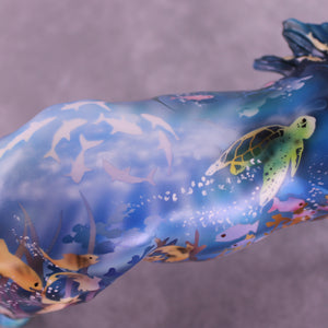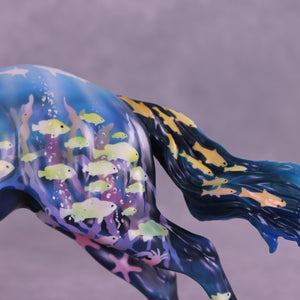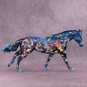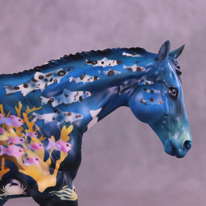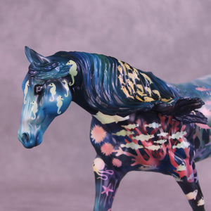 Reefy takes us on a deep-sea dive to a vibrant coral reef brimming with life. This mural by Kike (Enrique) Duarte is an incredible show of his intricately detailed paint work and creativity with zillions of layers to show depth as only he can do. A wide array of sea life from seahorses to octopi, starfish, and sea urchins swim through colorful corals. This fantastic piece is ready to make a splash in the decorator class, available in all finish options.