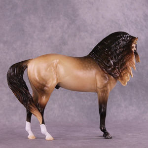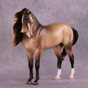 Regulus, the realistic version, is a stunning dappled silver buckskin with the most delicious shading and contrast through his whole design. His name means ‘little king’, which is so fitting for this release! He has a hidden lion in his face marking that is realistic for showing, and an optional Leo zodiac sign brand. His customizing features his windblown mane on his right side, leaving his show side head and neck clean and visible for maximum showing impact. He is LE-10 with all finish options available.