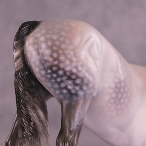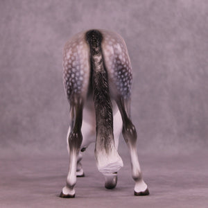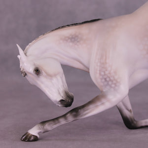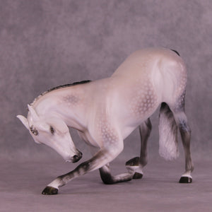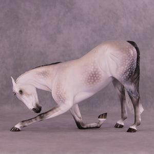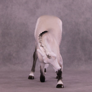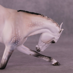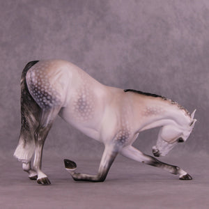 This is one of those special pieces where it’s very hard to tell what she started out as! Matt worked mostly with our Arabian Mare to create this dynamic piece, but you may also recognize Volo’s detailed expressive head and ears. Matt moved every part of this horse to create an extreme deep bow, completed with prim and tidy hunter braids and a braided tail. Ellen has finished this piece in a gorgeously dappled and shaded rose grey , with intricately detailed mane and tail locks showing their path through her braids.